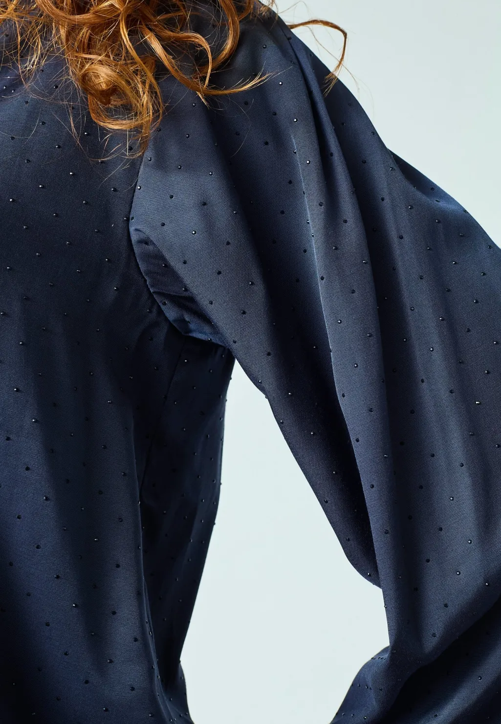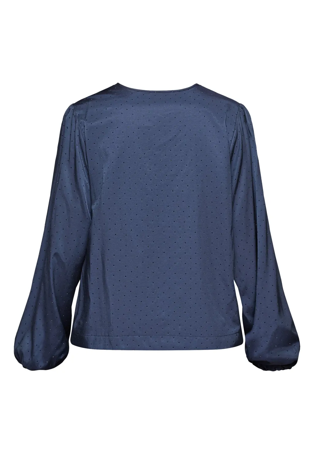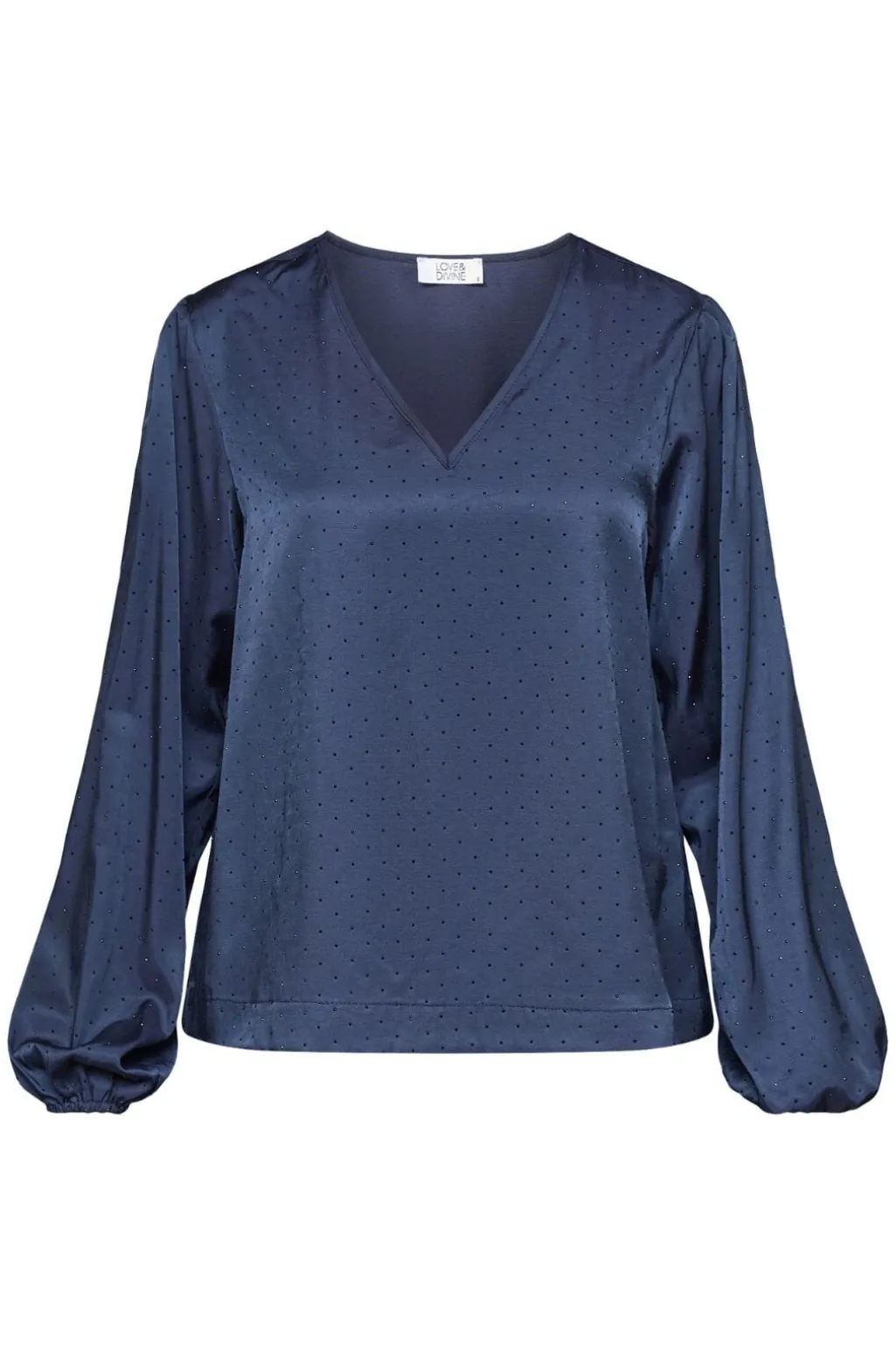 Mørkeblå bluse fra Love & Divine med diskret prikkemønster. Blusen har en V-hals og lange, voluminøse ærmer med elastiske manchetter.