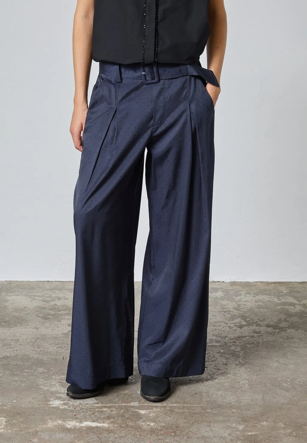 Mørkeblå bukser fra Love & Divine med små prikker og pailletter. Bukserne har høj talje, løs pasform og går til anklen.