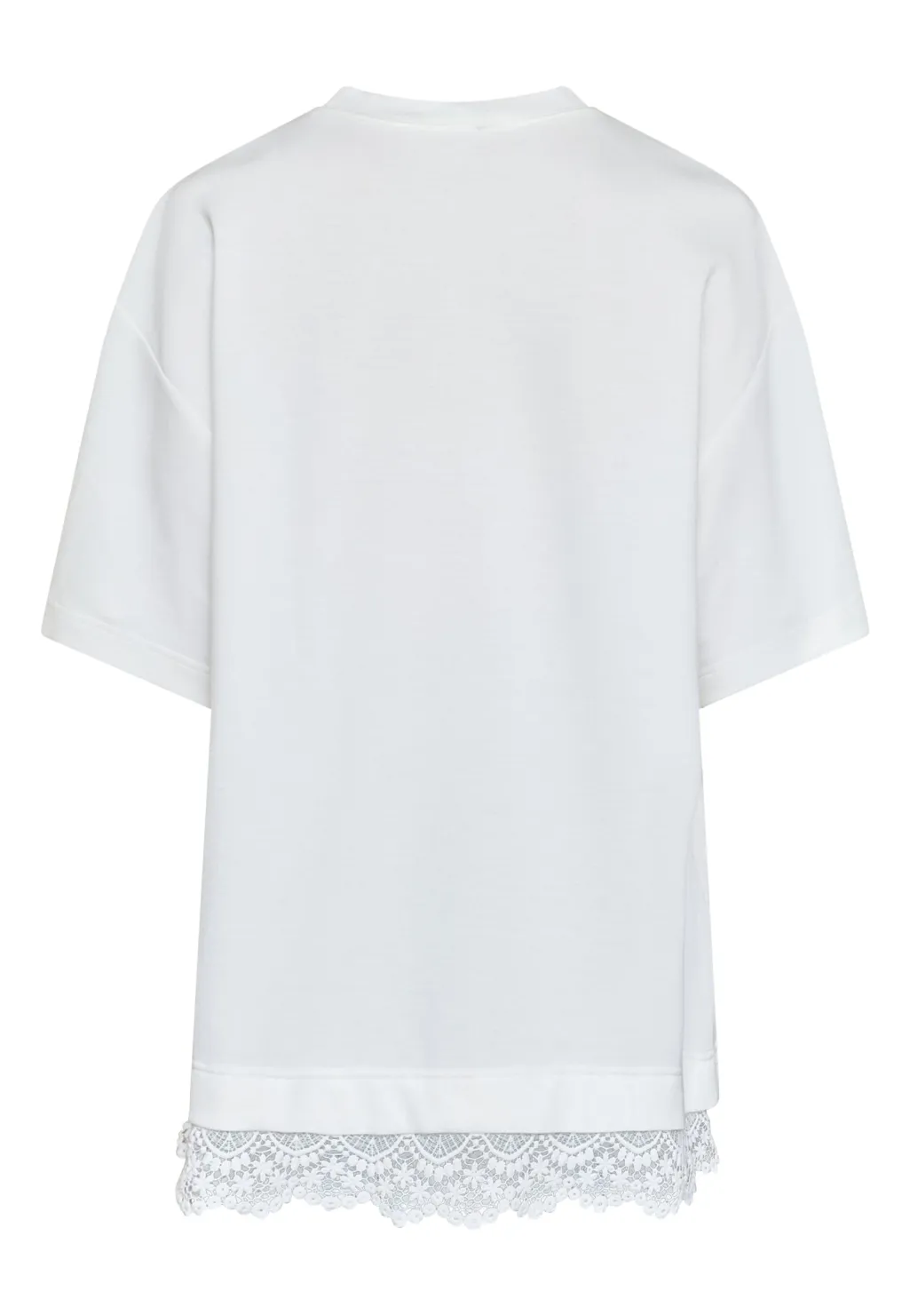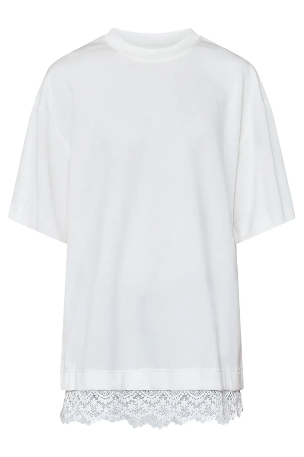 Hvid t-shirt fra Love & Divine med påsyet blondekant langs den nederste kant. Den har en oversized pasform med korte ærmer.
