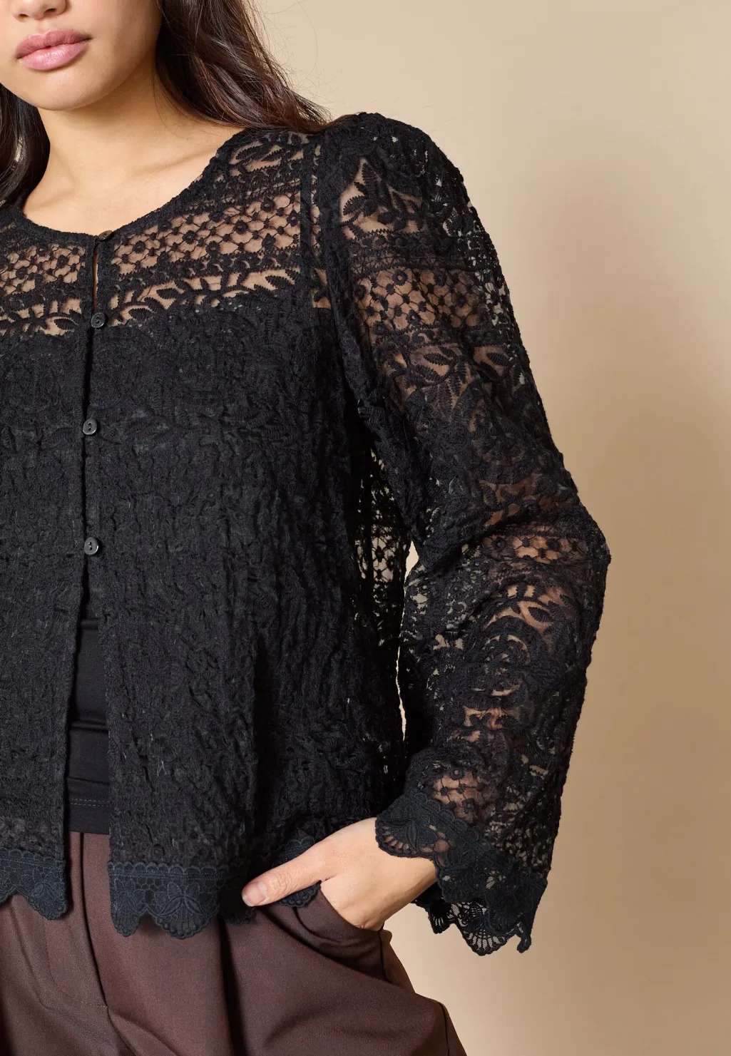 Sort bluse fra Love & Divine med blondemønster. Blusen har lange ærmer og knaplukning foran. Den passer til formelle og festlige lejligheder.