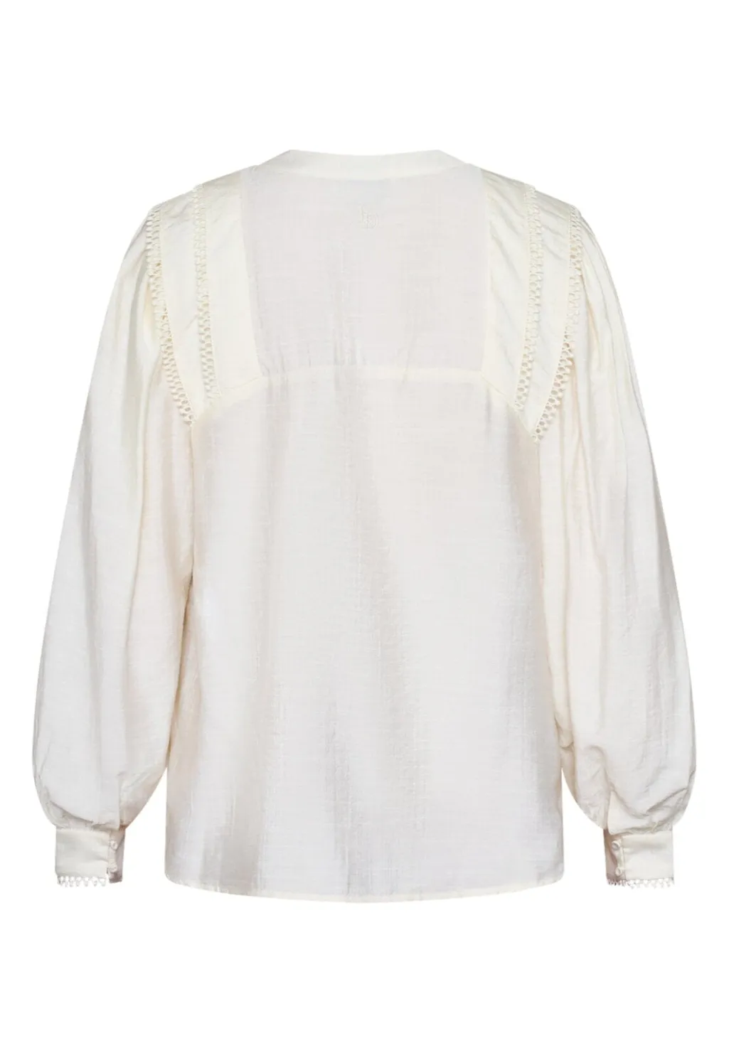 Cremefarvet bluse fra Love & Divine med løs pasform og lange ærmer. Blusen har en V-hals og dekorative flæsedetaljer på skuldrene og manchetterne.