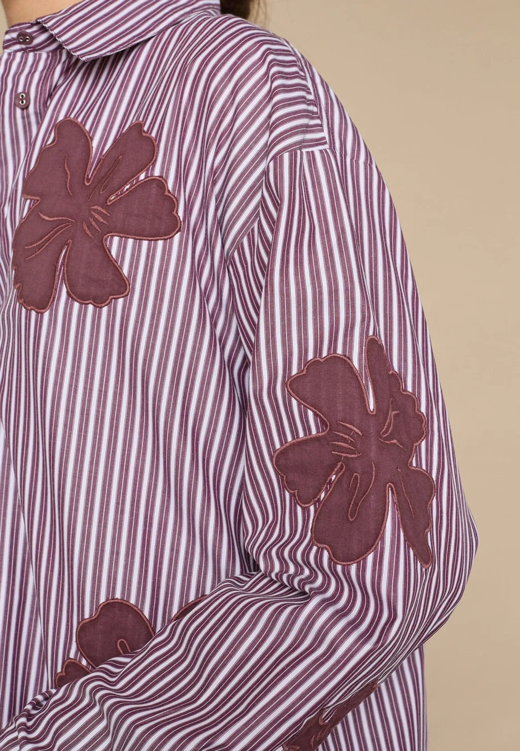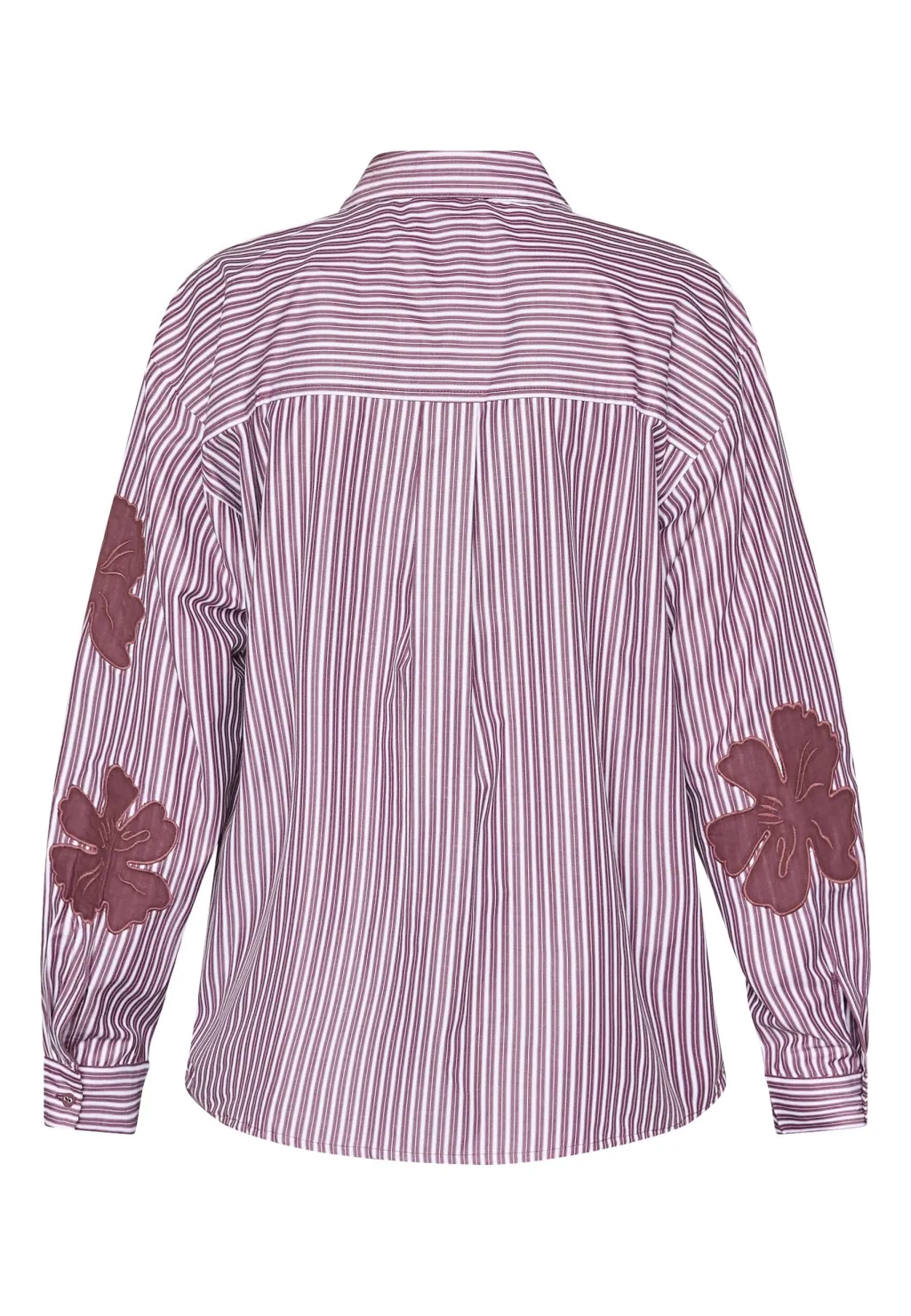 Stribet skjorte fra Love & Divine med store blomsterapplikationer i bordeaux. Skjorten har klassisk krave og knaplukning.