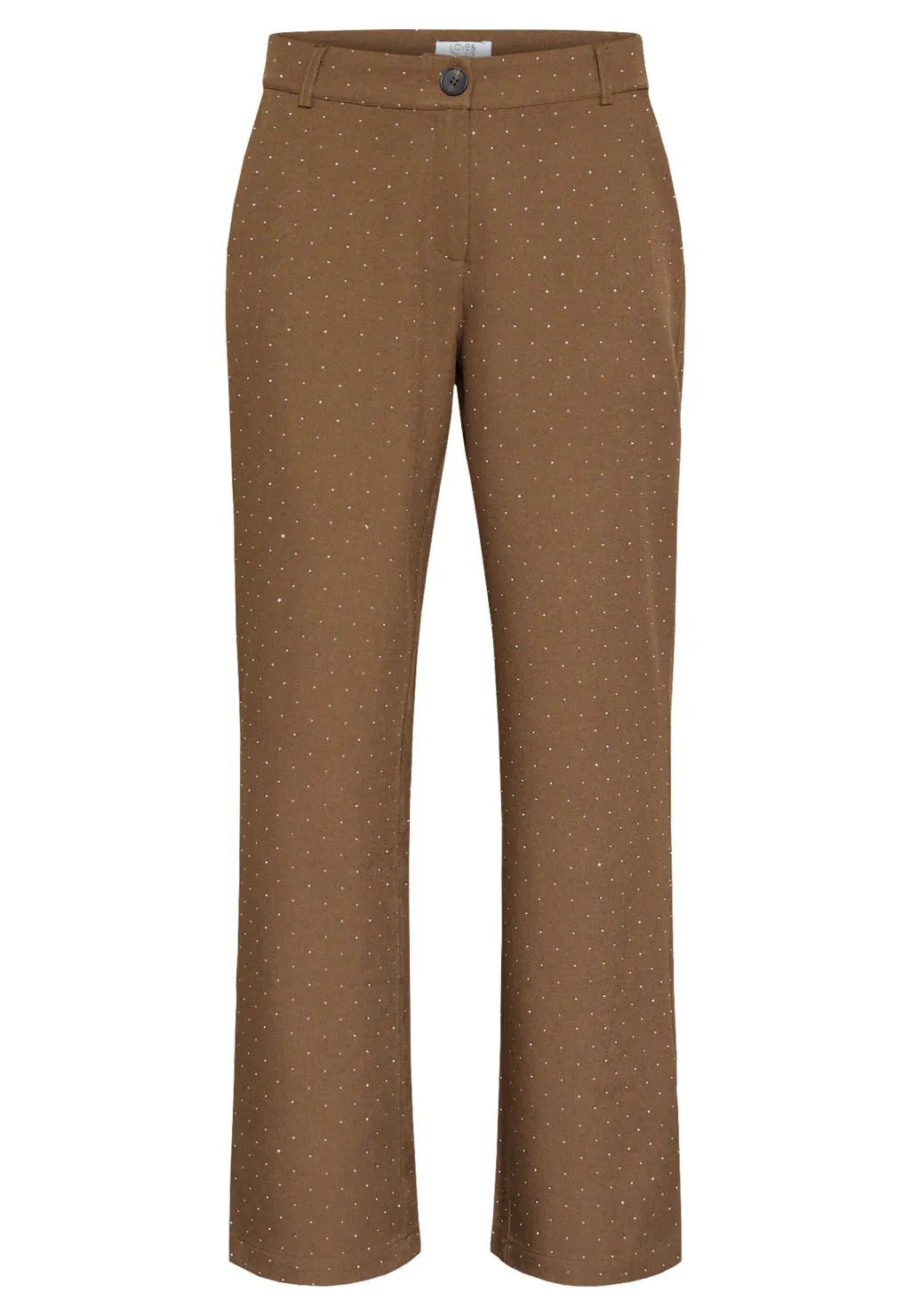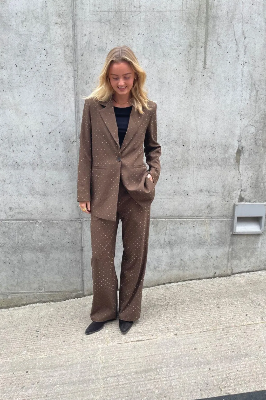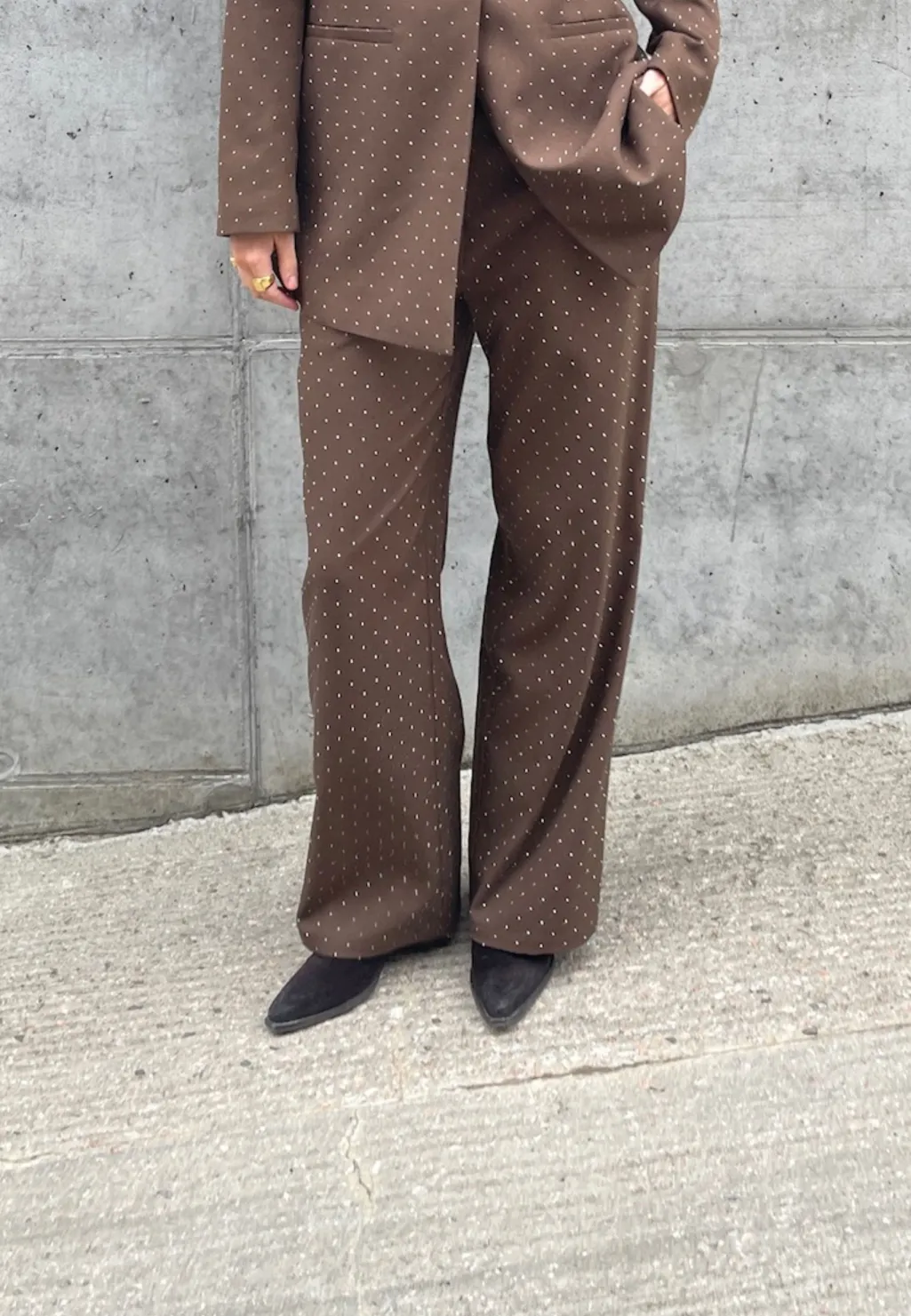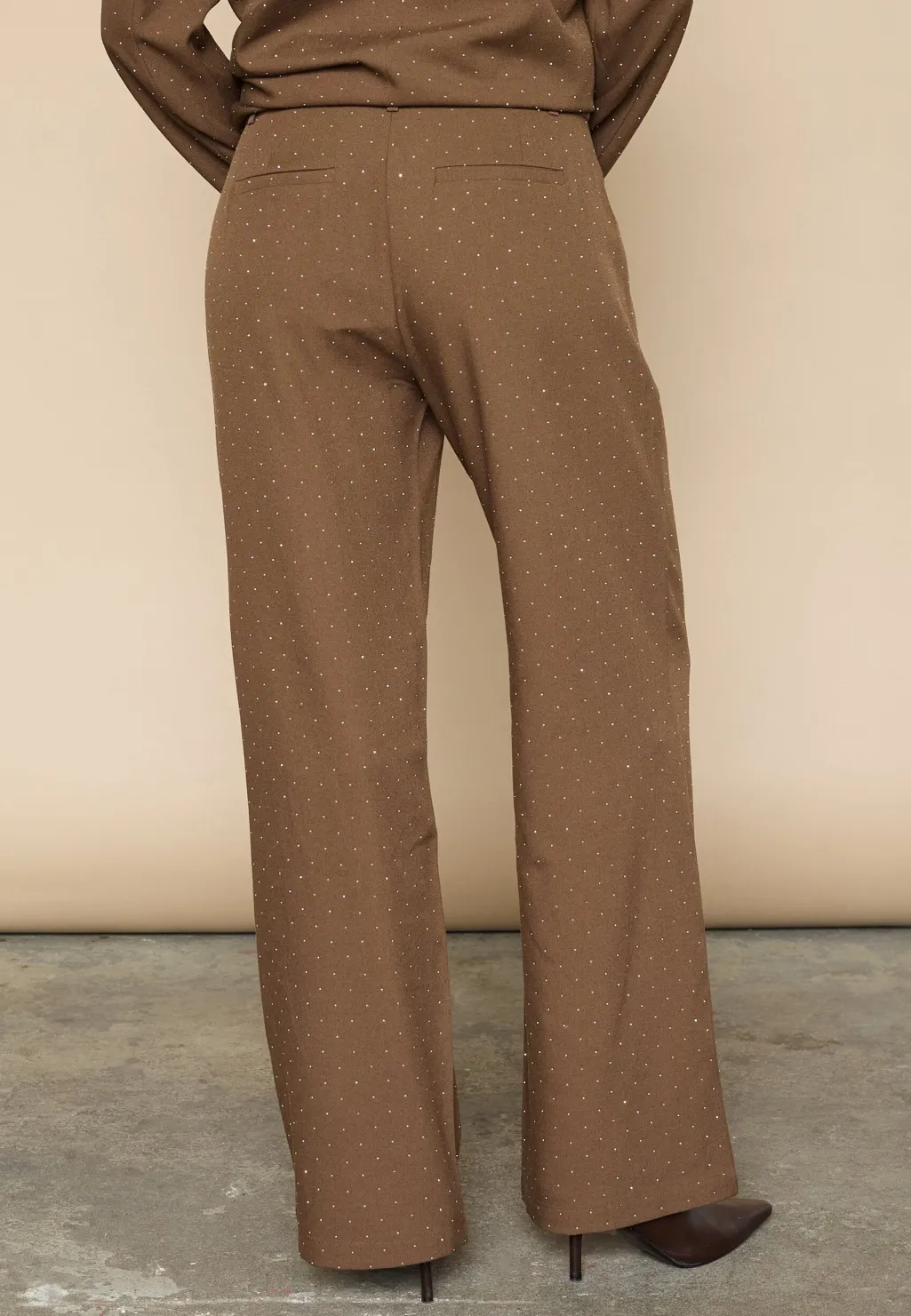 Brune bukser fra Love & Divine med små rhinestone-detaljer over hele stoffet. Bukserne er en del af et jakkesæt med en matchende blazer.