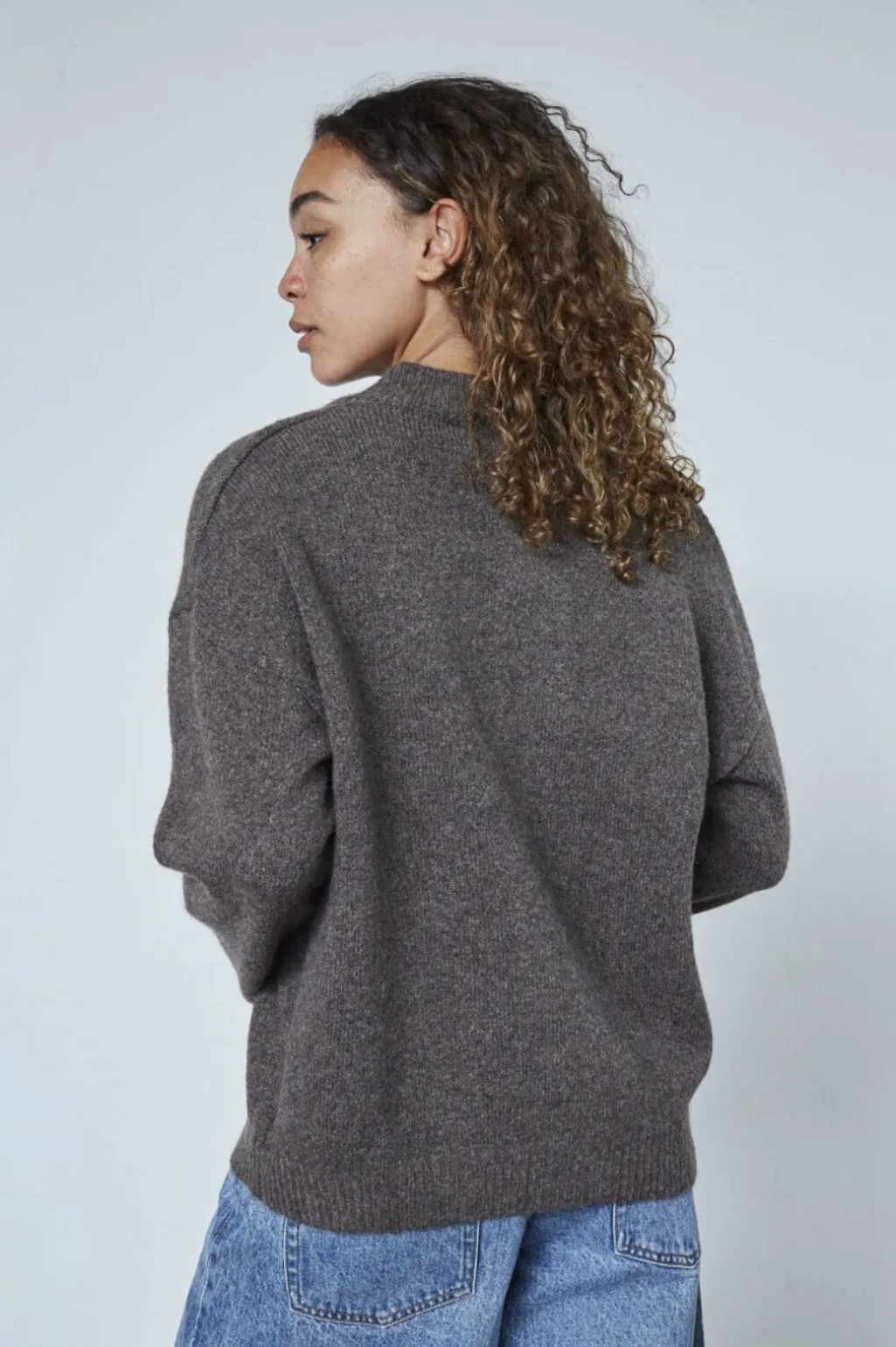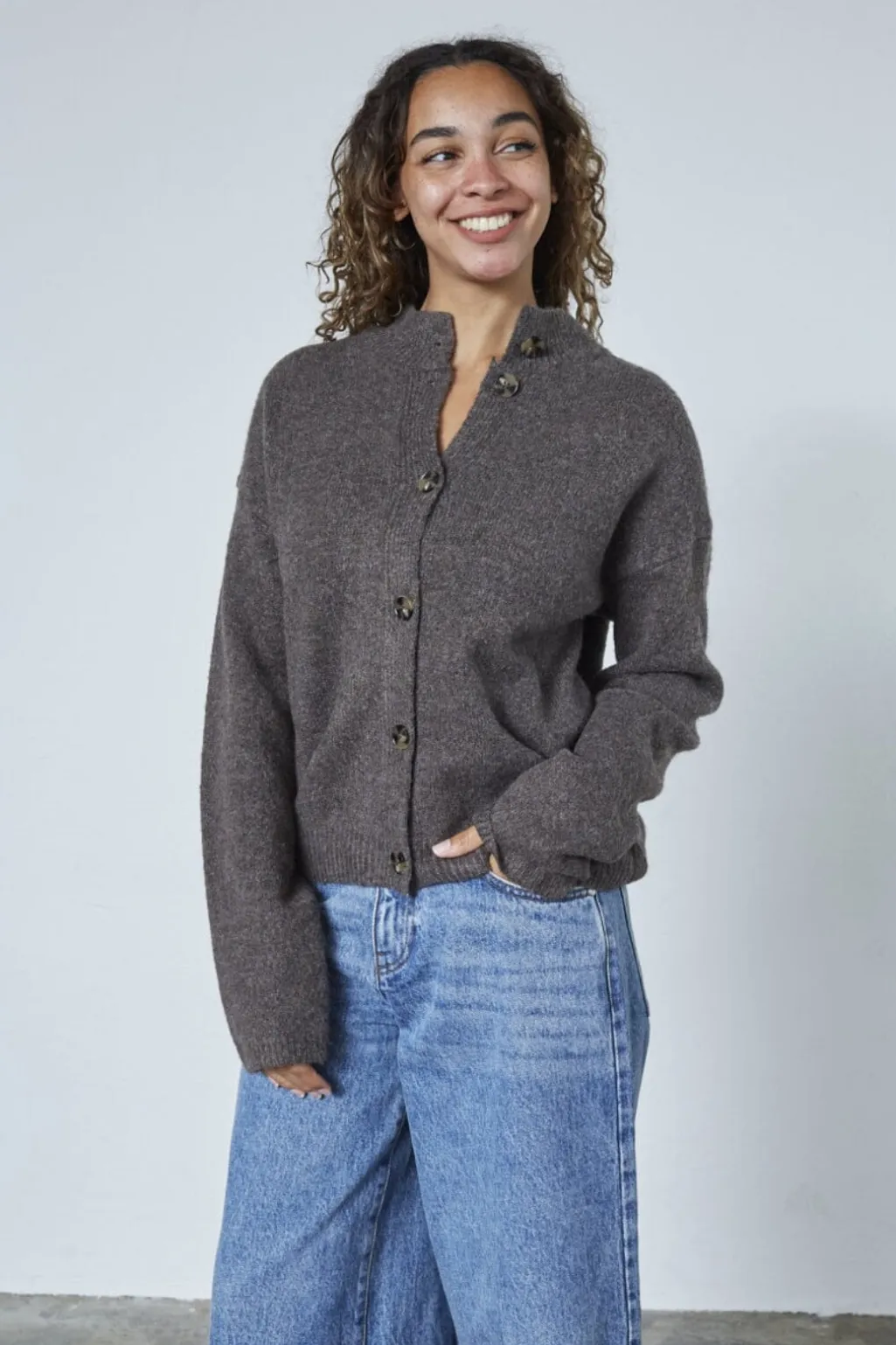 Meleret brun cardigan fra Sisters Point med rund halsudskæring og gennemgående knaplukning. Cardiganen har lange raglanærmer og ribstrikkede kanter.