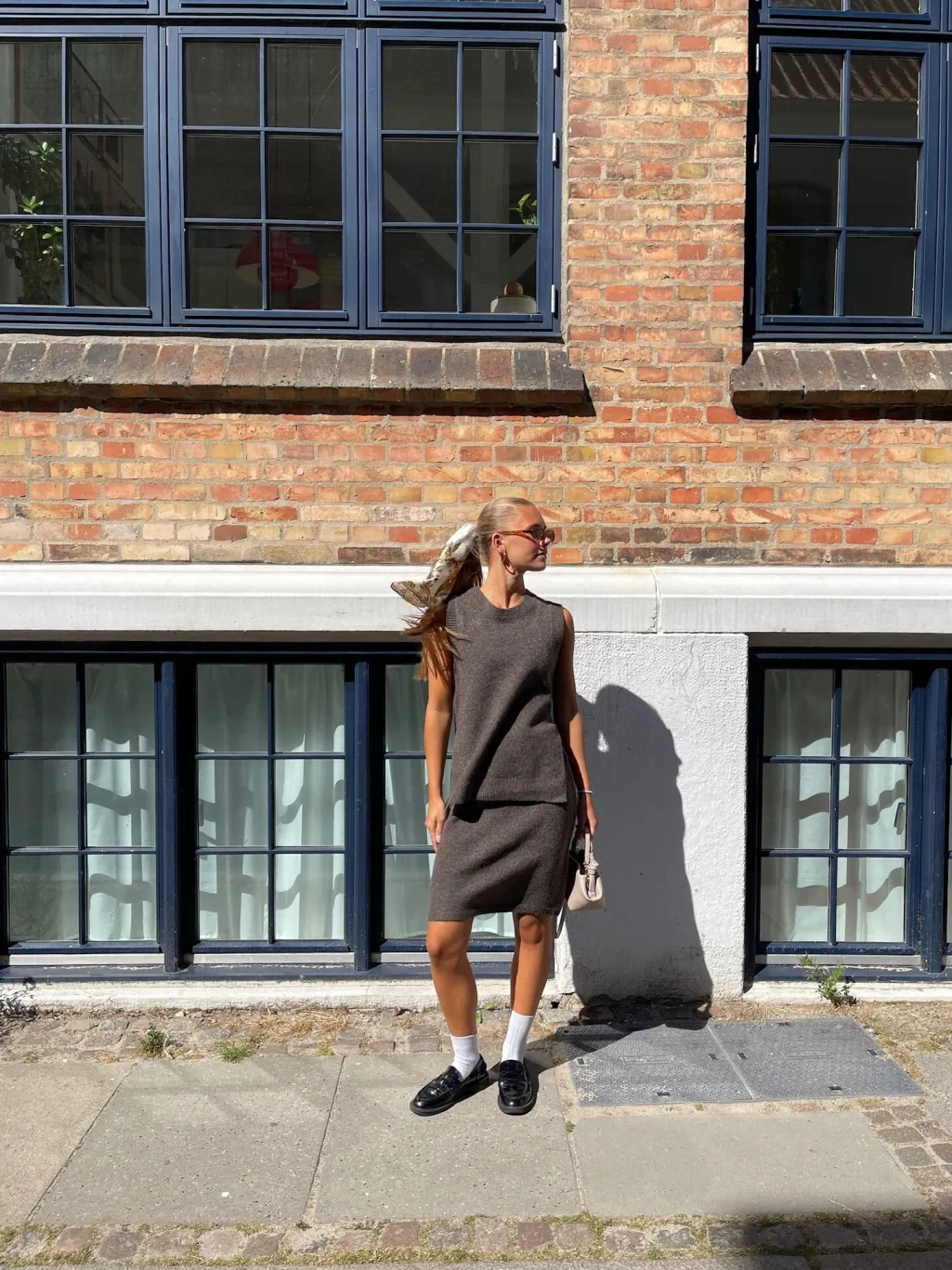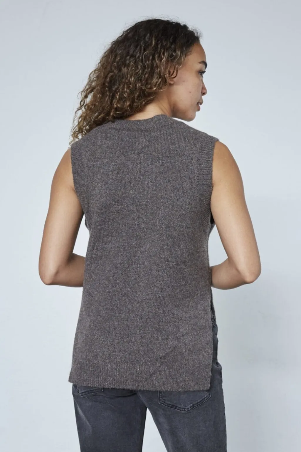Brun meleret strikket vest fra Sisters Point. Den har en rund halsudskæring og brede ribstrikkede kanter ved ærmegabene og forneden.