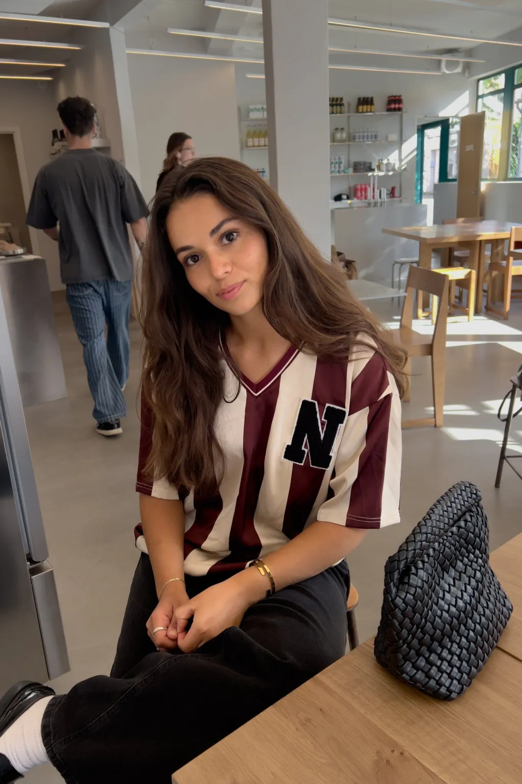 Stribet bluse fra Noella i mørkerøde og cremefarvede striber. Blusen har broderi på brystet og en V-hals.