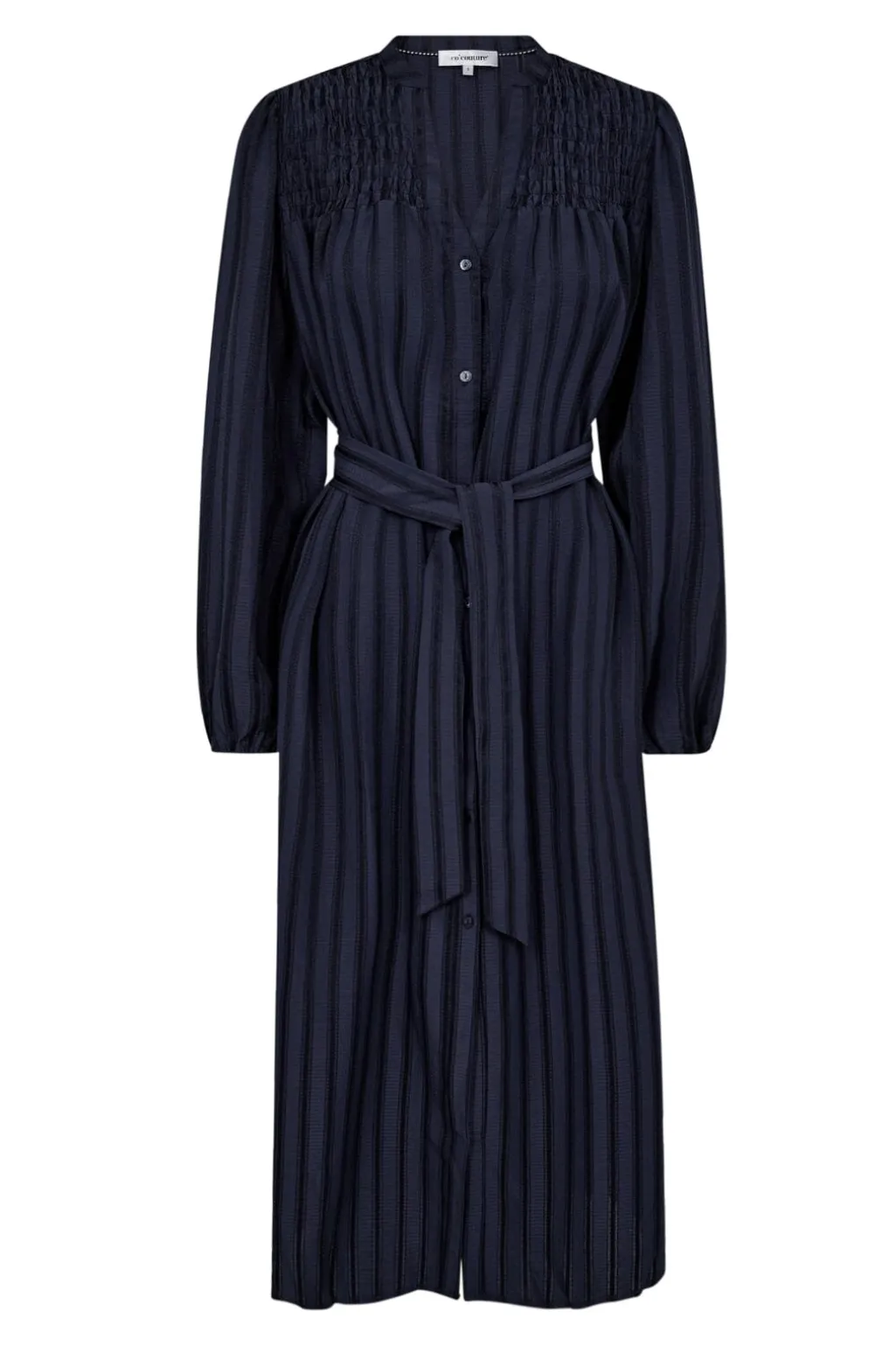 Mørkeblå kjole fra Co´couture med striber. Kjolen har smockede skuldre, knaplukning foran og et bælte i taljen. Den kalvelange model har V-udskæring og lange ærmer.