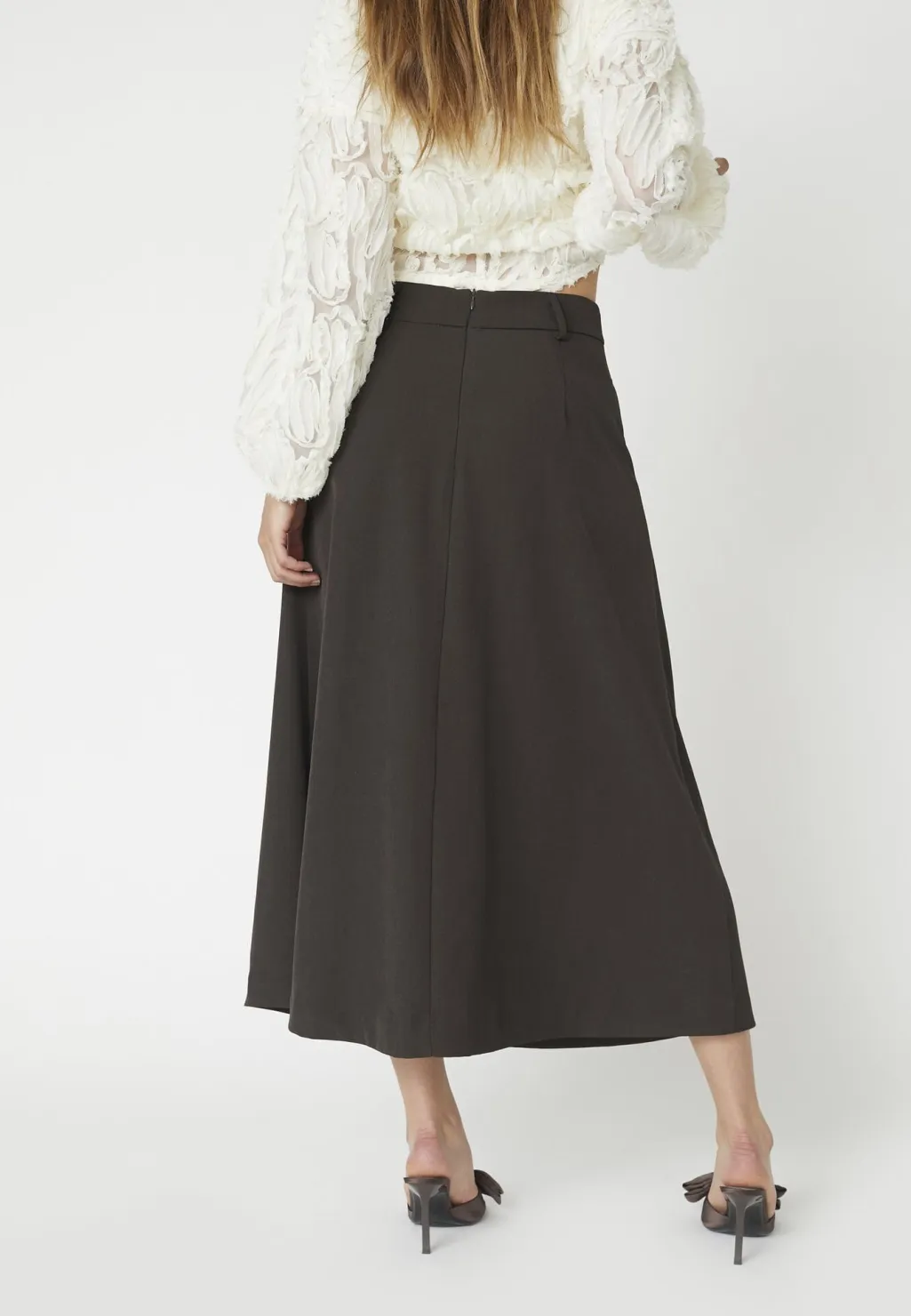 Mørkebrun nederdel fra Co´Couture med læg foran, lommer og bæltestropper i taljen. Nederdelen har en løs pasform og går til midt på læggen.