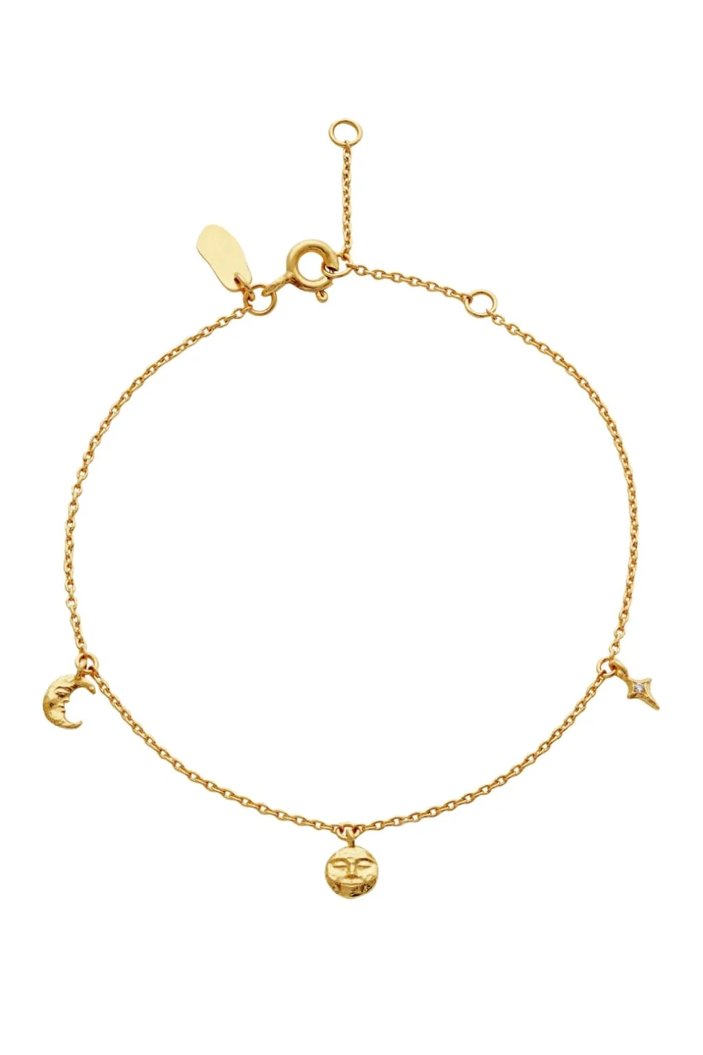 Armbånd fra Maanesten lavet af genanvendt sterlingsølv belagt med 18 karat guld. Designet er inspireret af månens faser med tre vedhæng: måne, sol og stjerne.