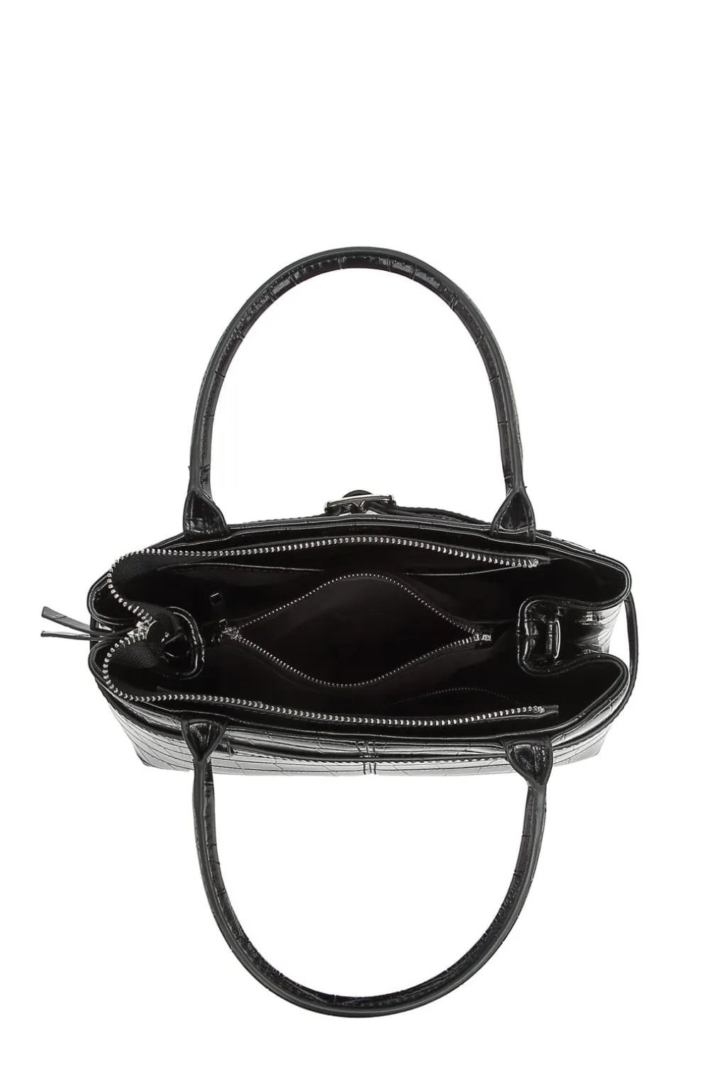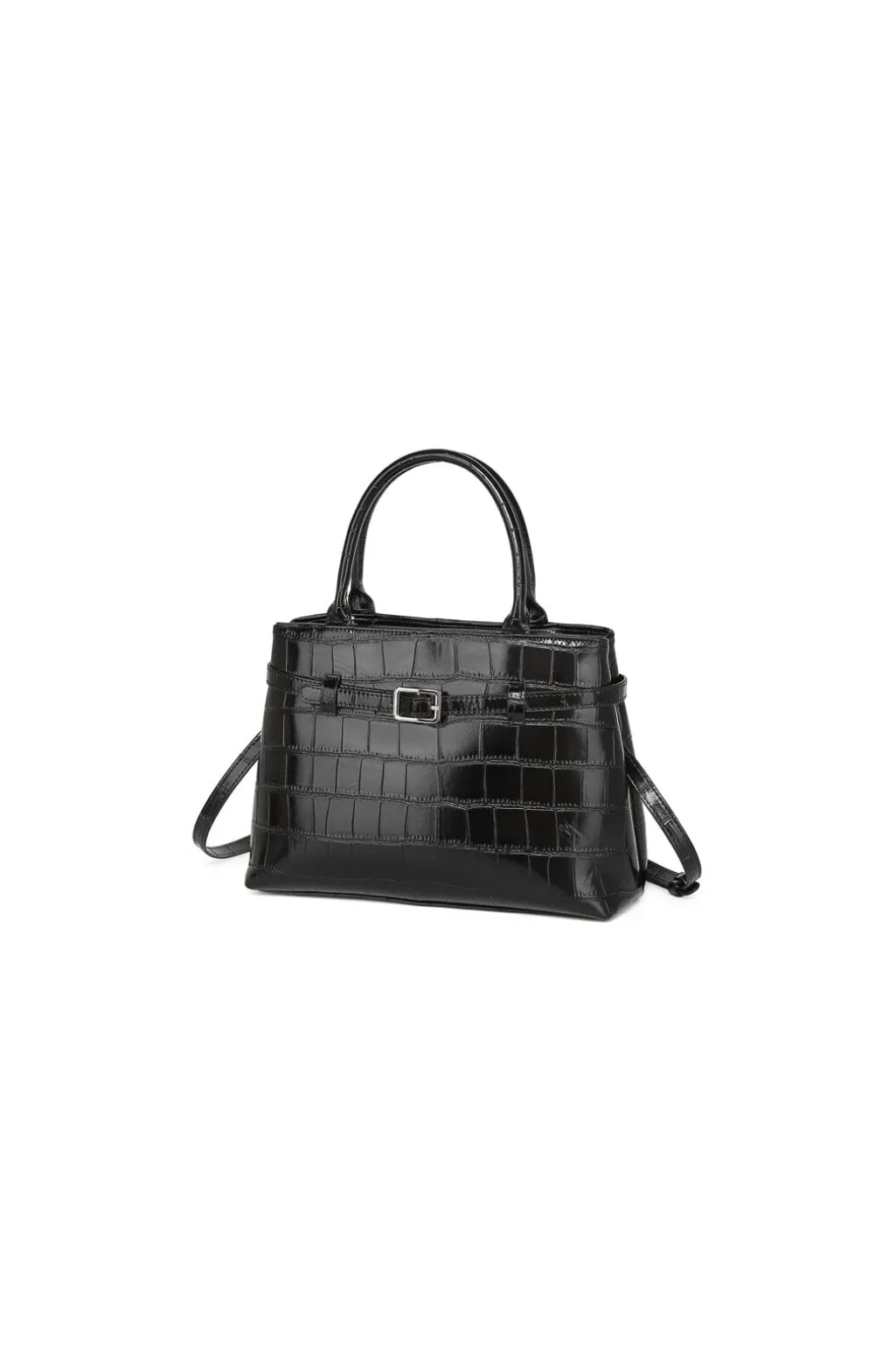 Sort taske fra Noella med krokodillemønster på overfladen. Tasken har to håndtag og en aftagelig skulderrem med bælte-detalje.