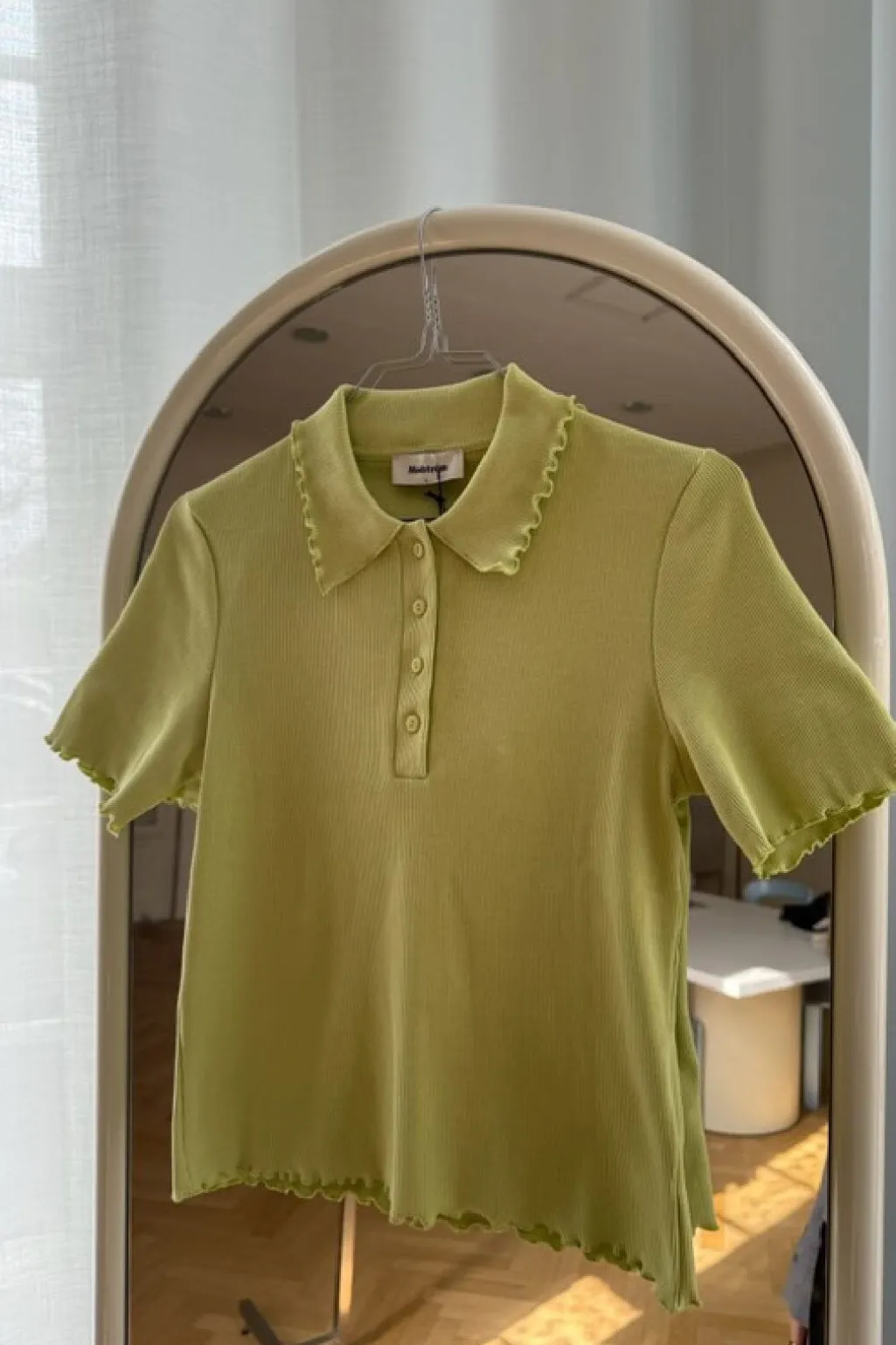 Lys grøn polo fra Modström med rynkede kanter ved kraven og ærmerne. Den figursyede jersey-polo har en klassisk knaplukning og korte ærmer med overlockede kanter.