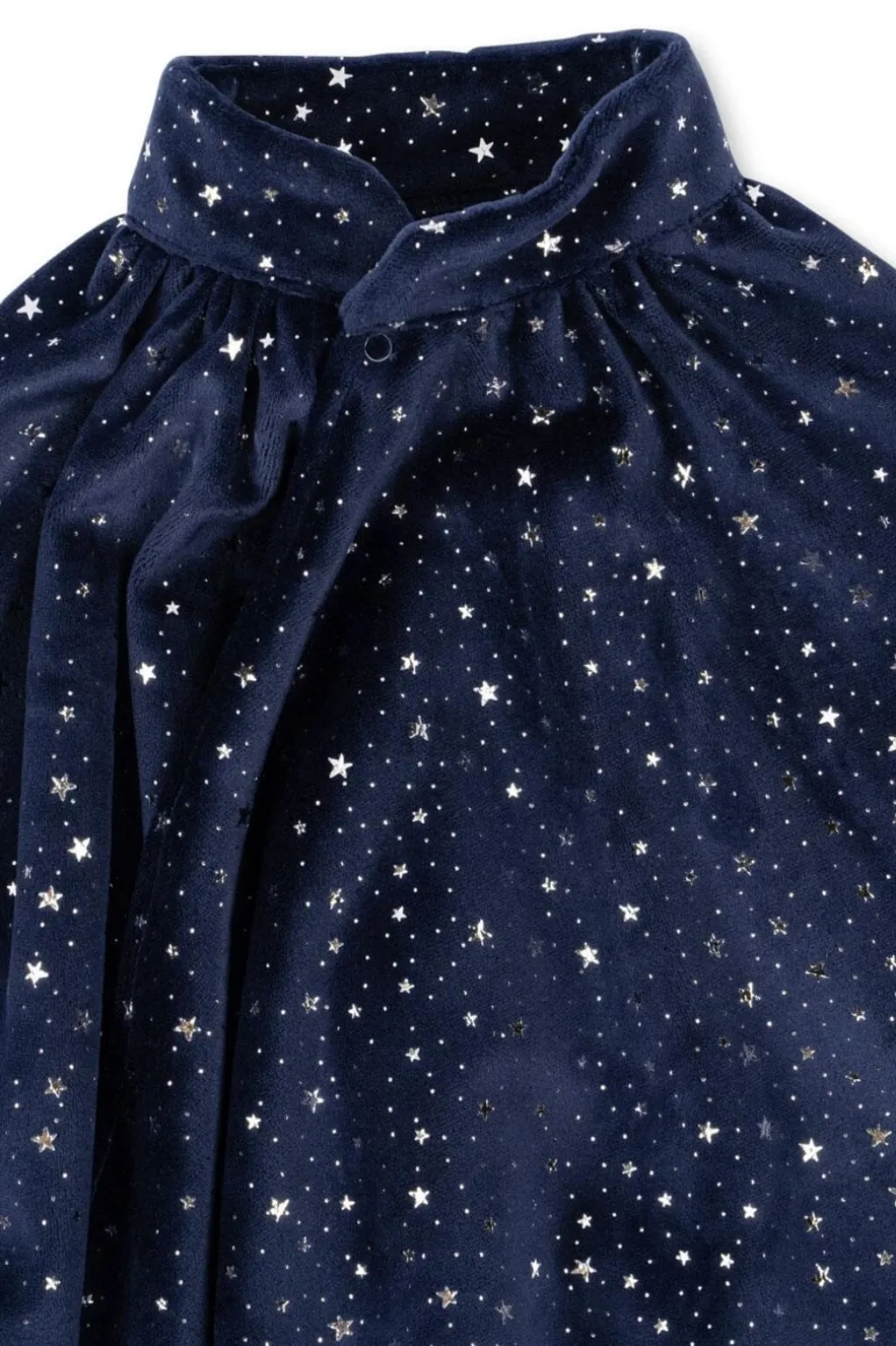 Stjernehimmelmønsteret på den mørkeblå baggrund skaber et magisk udtryk, der passer til fantasifuld leg og udklædning.
