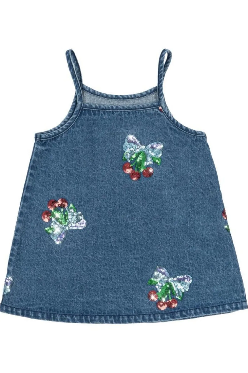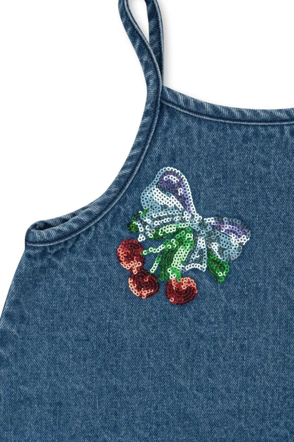 Stropkjole fra Konges Sløjd med et denim-inspireret udseende i blå. Kjolen har pailletdekorationer i form af sløjfer og kirsebær.