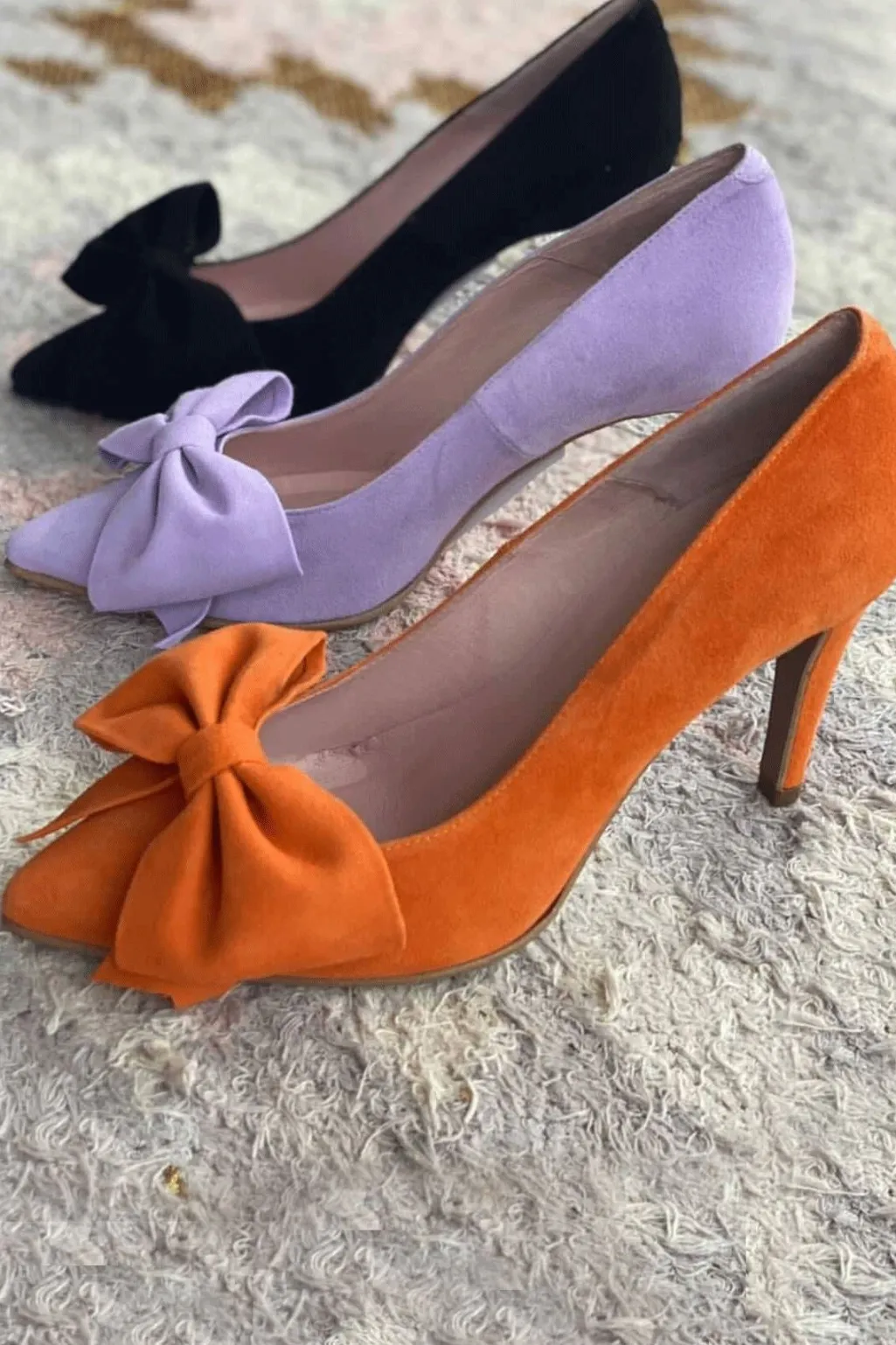 Sorte stiletter i ruskind og læder med spids tå og sløjfedetalje. Skoene har en stilethæl på 8-10 cm og passer godt til festlige arrangementer.