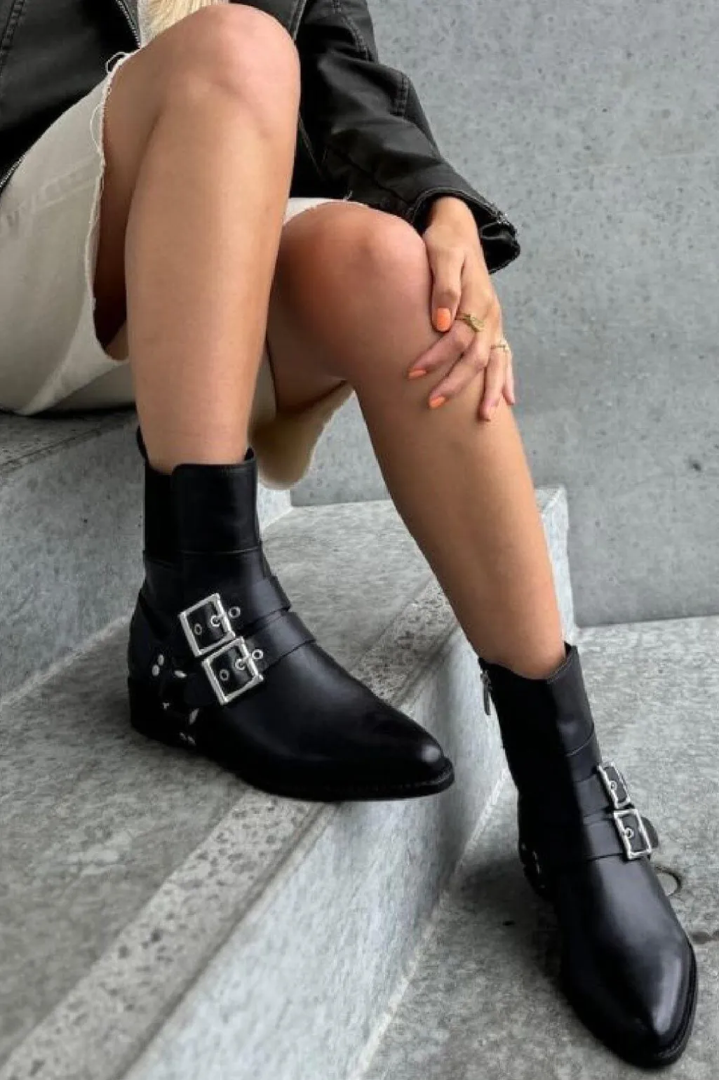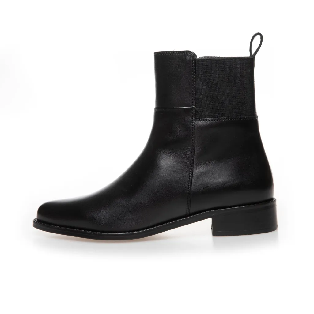 Sort ankelstøvle i læder med to spænder på siden. Støvlen har en spids tå og en lav blokhæl, der giver god støtte ved gang.