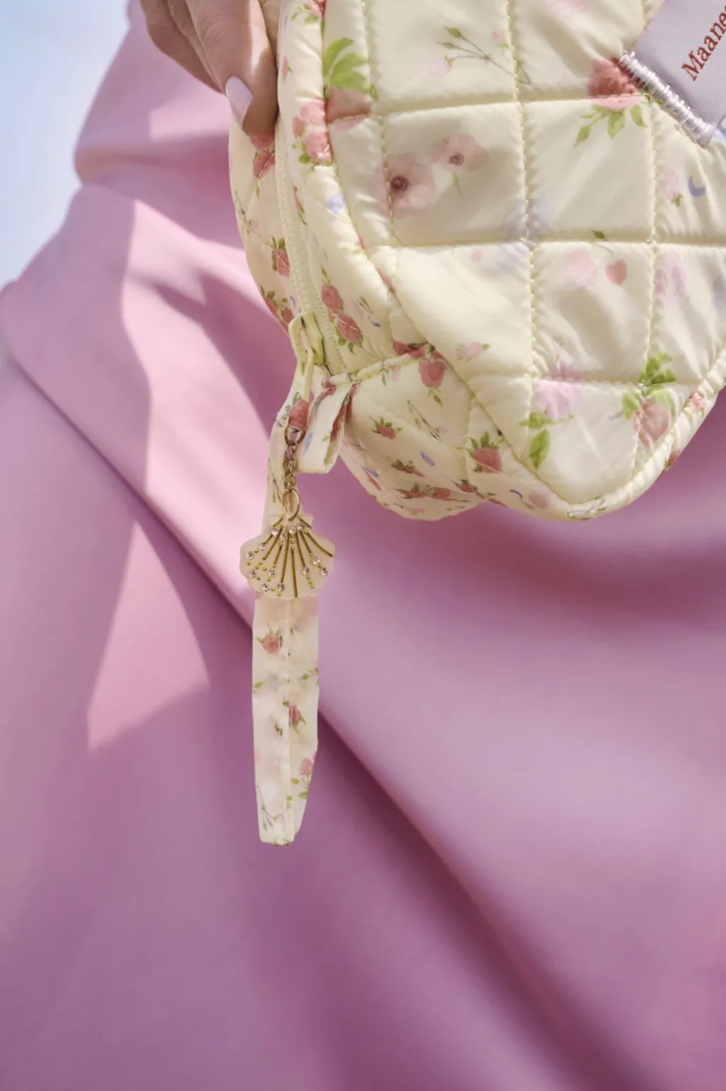 Quiltet makeuptaske fra Maanesten med blomster- og skalmønster på lys baggrund. Tasken har en praktisk størrelse til både hverdagsbrug og når du skal ud.