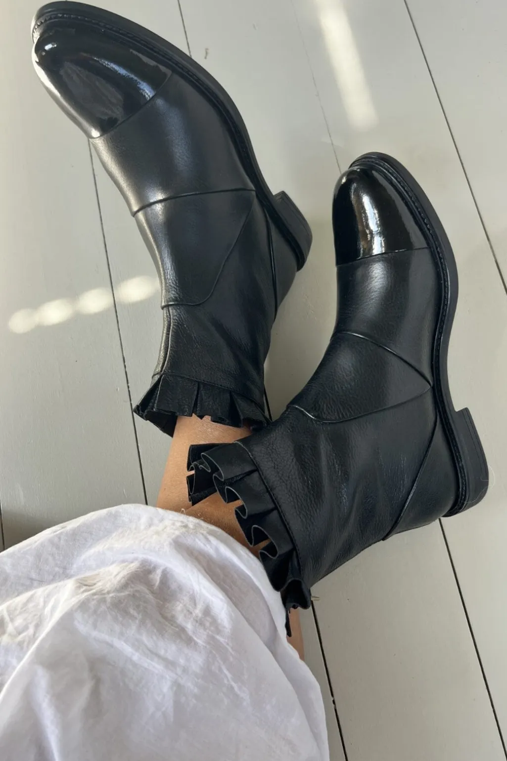 Ankelstøvler i meget blødt læder, med blød flæsekant og lynlås bagpå. Blød og flexibel gummisål og indersål med vores specielle Copenhagenshoes latex skum, der er skøn at gå på.