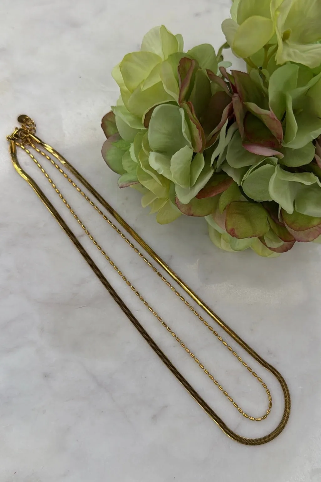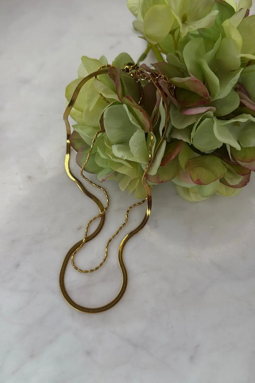 Forgyldt halskæde fra Mellow Moon med flere lag af kæder. De forskellige kædetyper kombinerer en snoet og en glat kæde, der sammen skaber et lagdelt look.