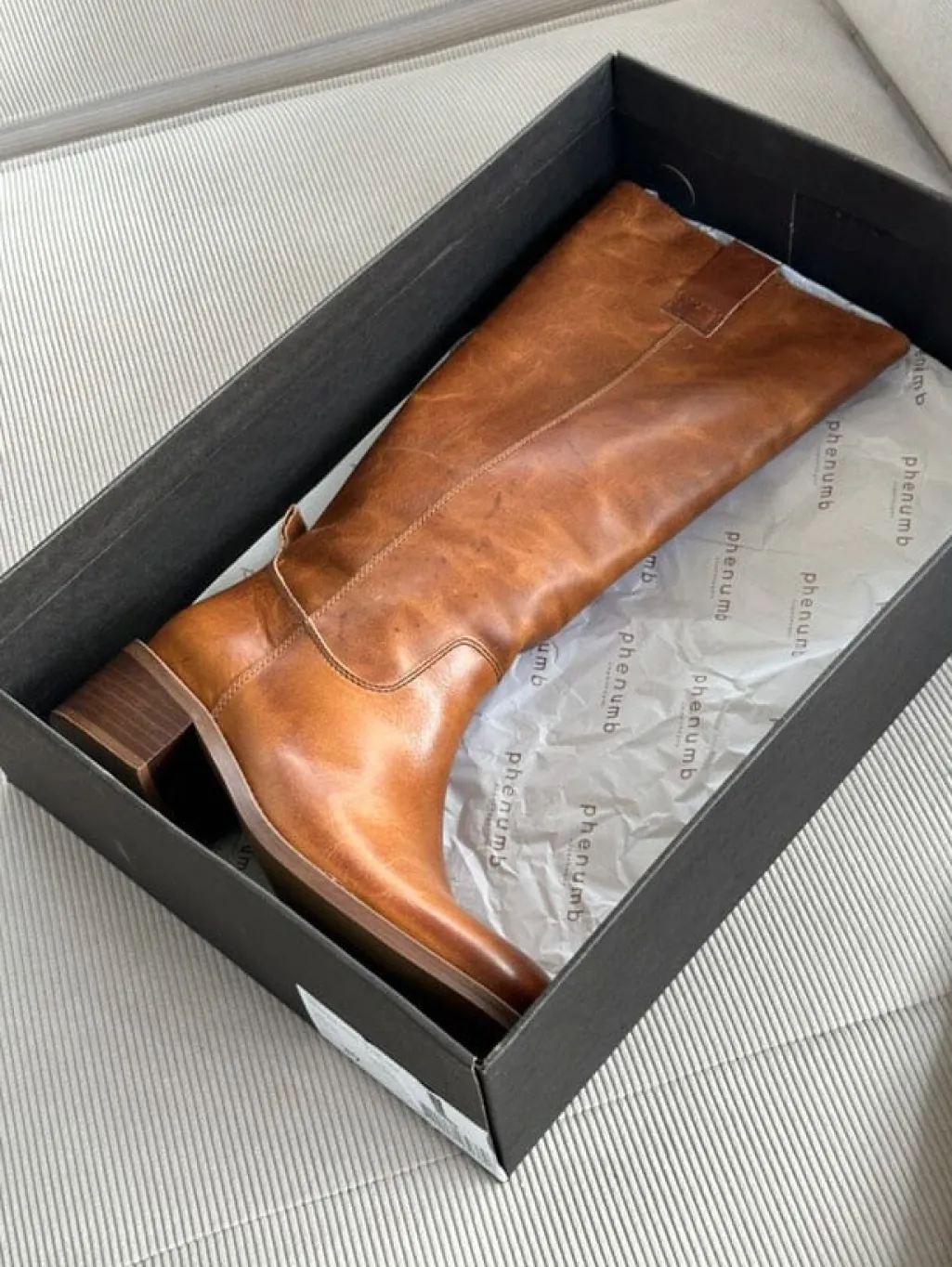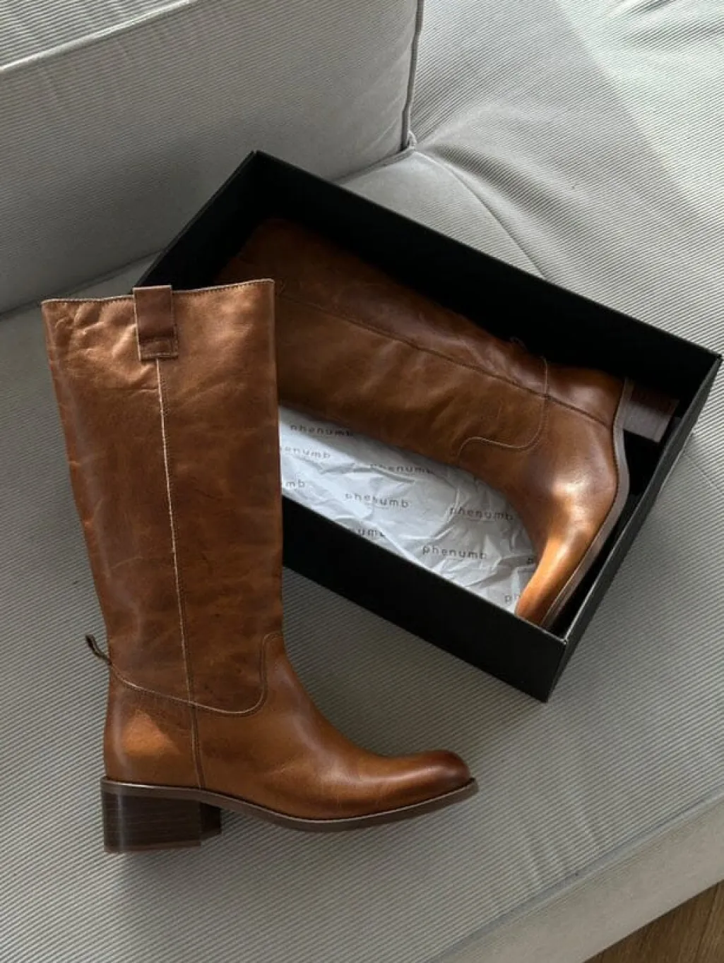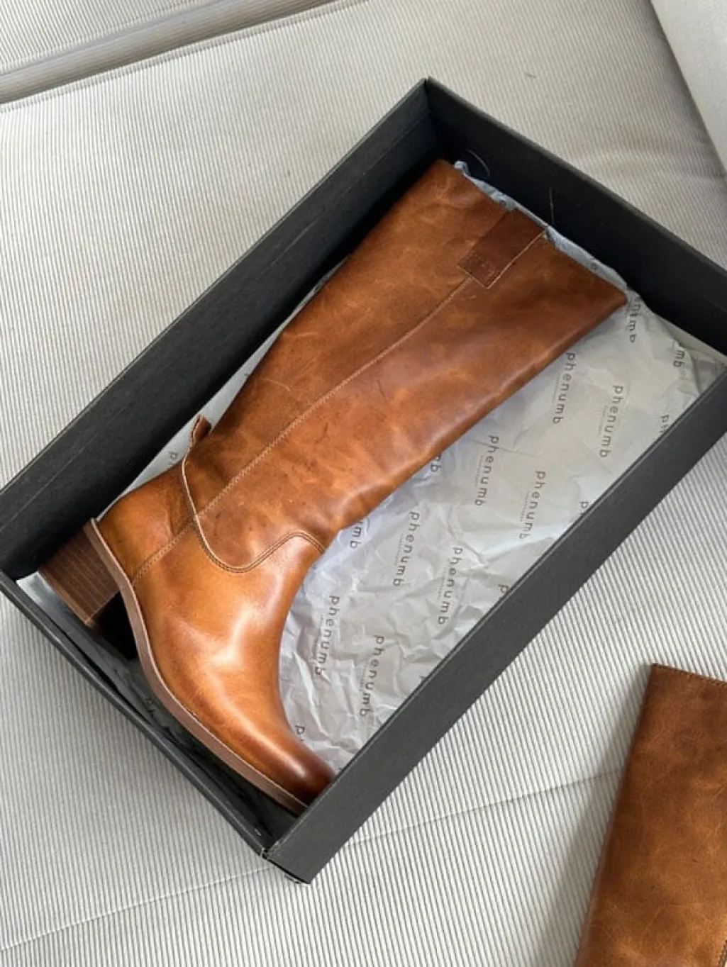Lange støvler fra Phenumb Copenhagen i poleret cognacfarvet læder. Støvlerne har høj skaft og en stabil blokhæl, der er mindre end 5 cm.