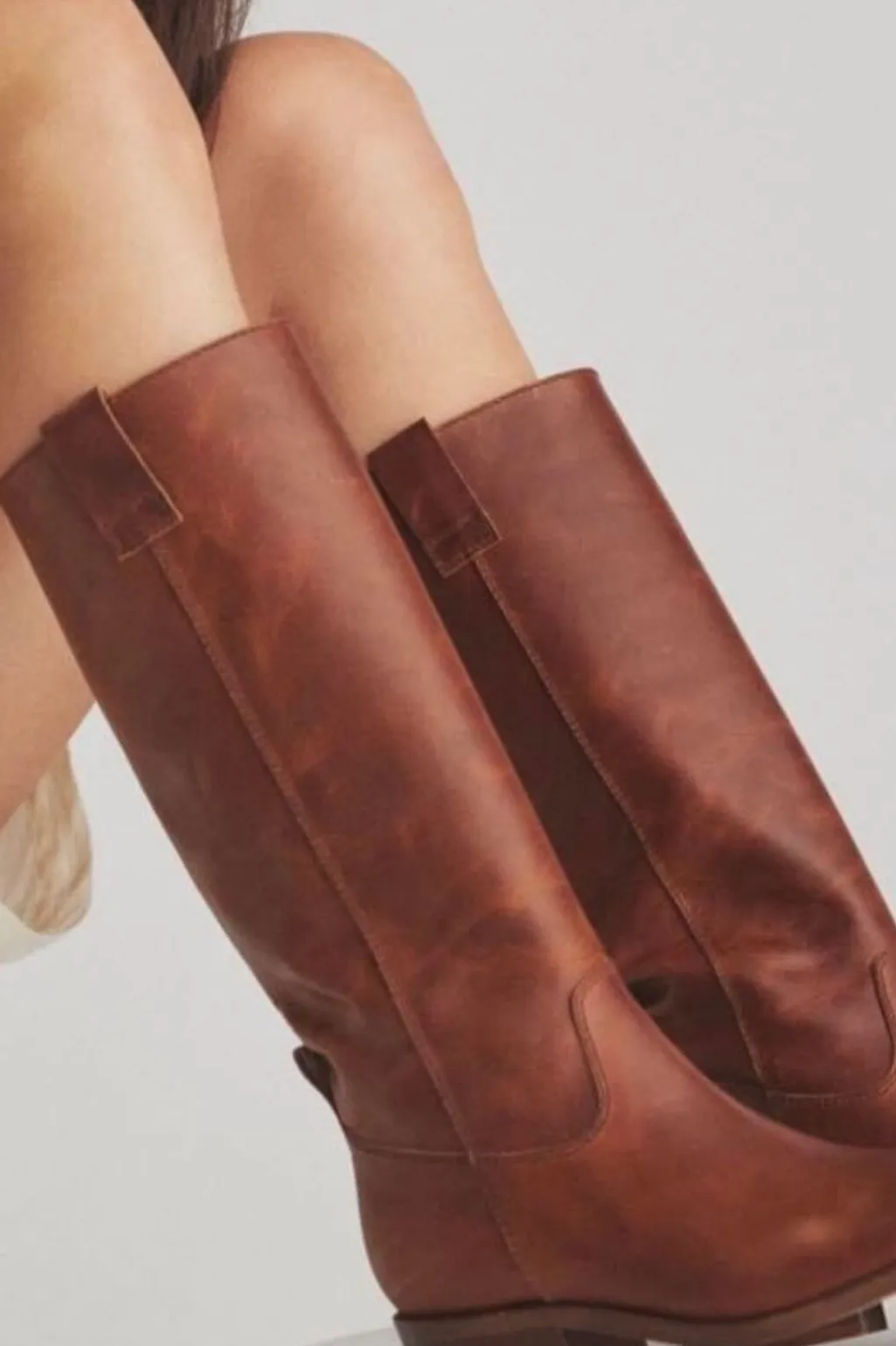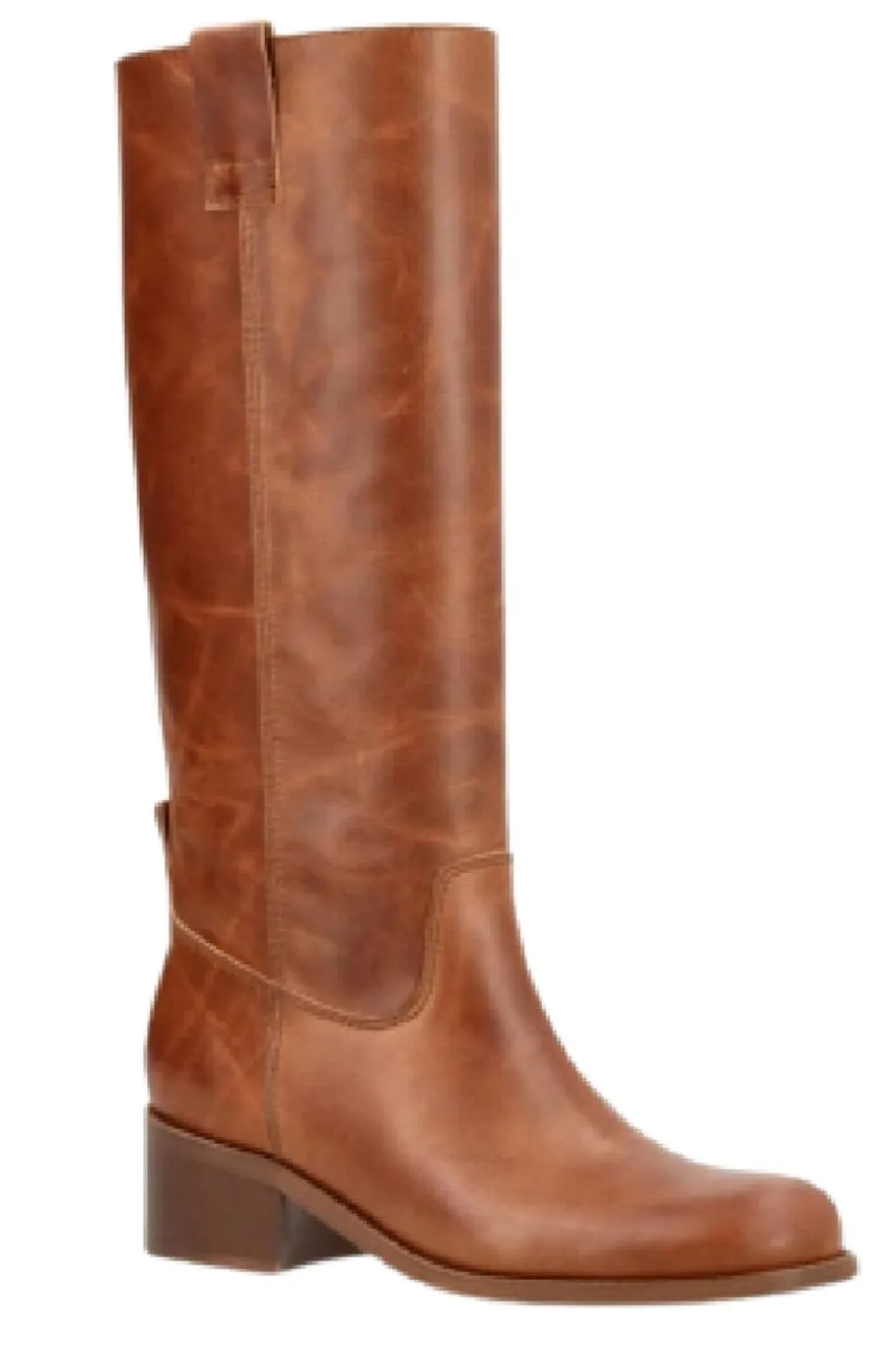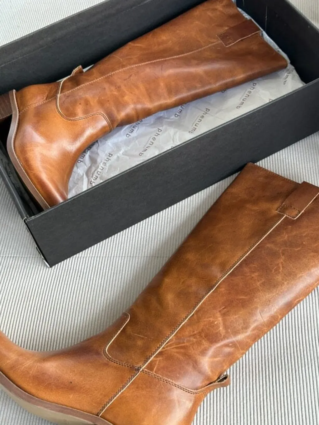 Lange støvler fra Phenumb Copenhagen i poleret cognacfarvet læder. Støvlerne har høj skaft og en stabil blokhæl, der er mindre end 5 cm.