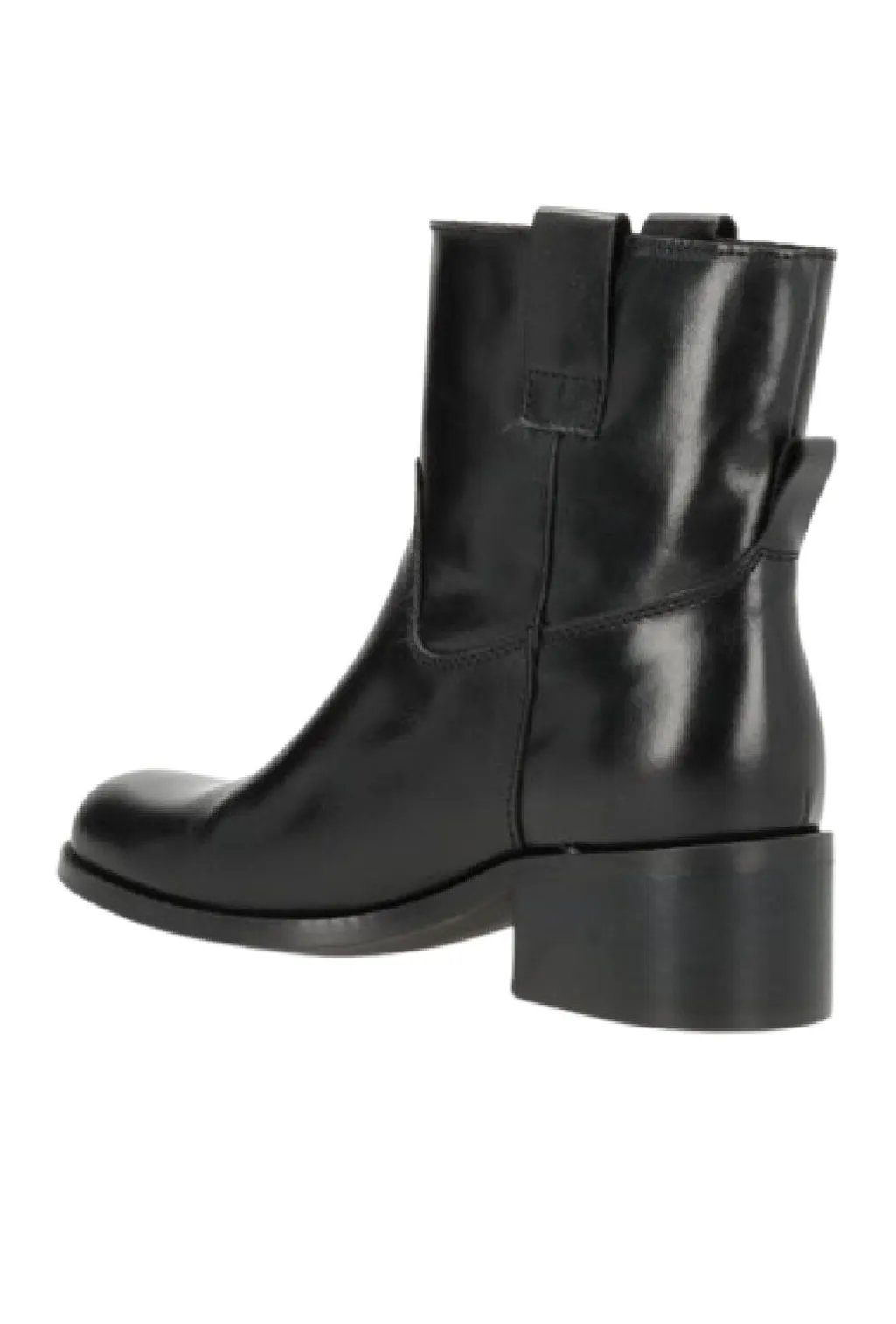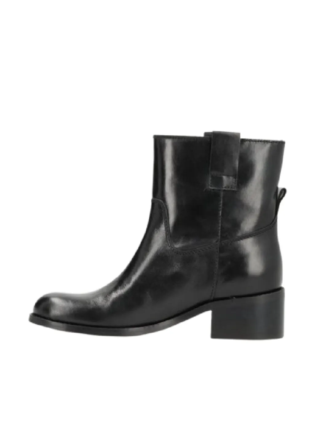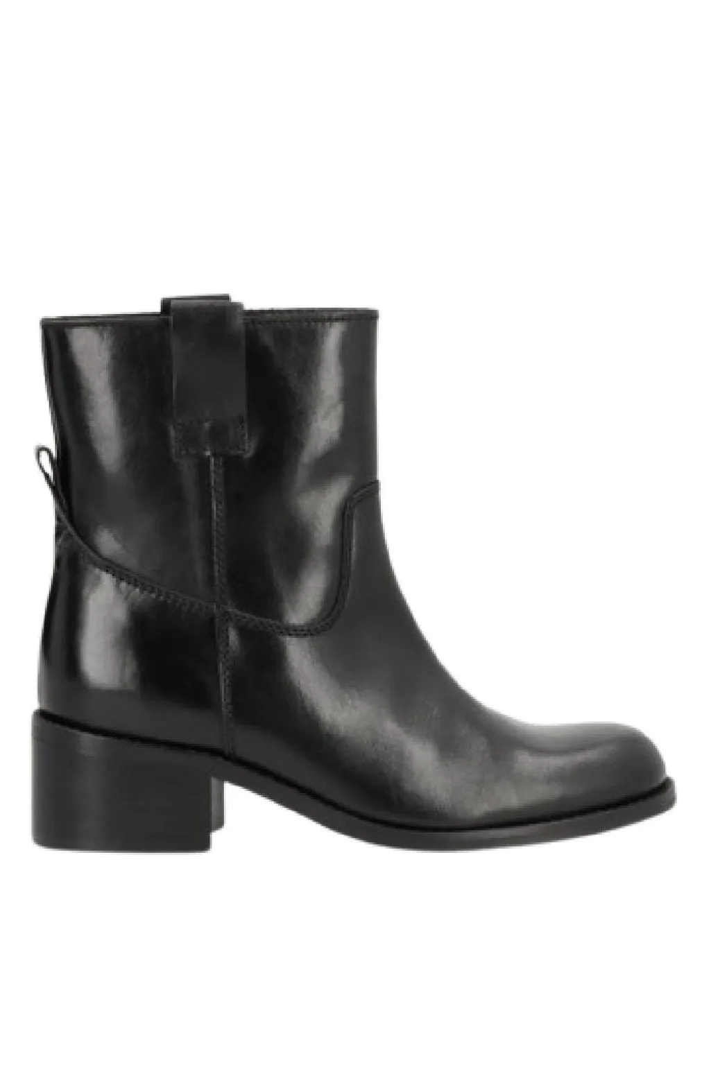 Sort ankelstøvle fra Phenumb Copenhagen med glat læderfinish og lav blokhæl. Støvlen har et enkelt design med rund tå og ingen lukning.