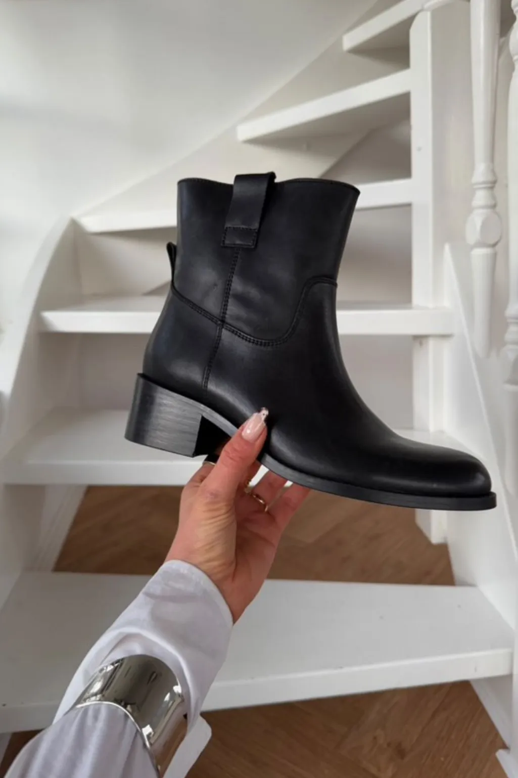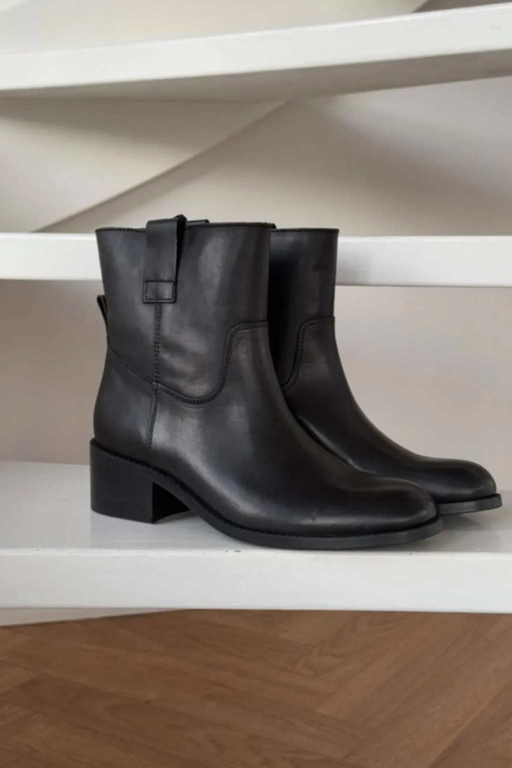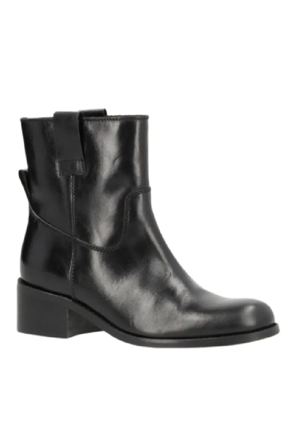 Sort ankelstøvle fra Phenumb Copenhagen med glat læderfinish og lav blokhæl. Støvlen har et enkelt design med rund tå og ingen lukning.