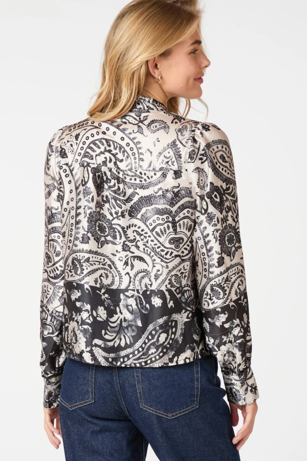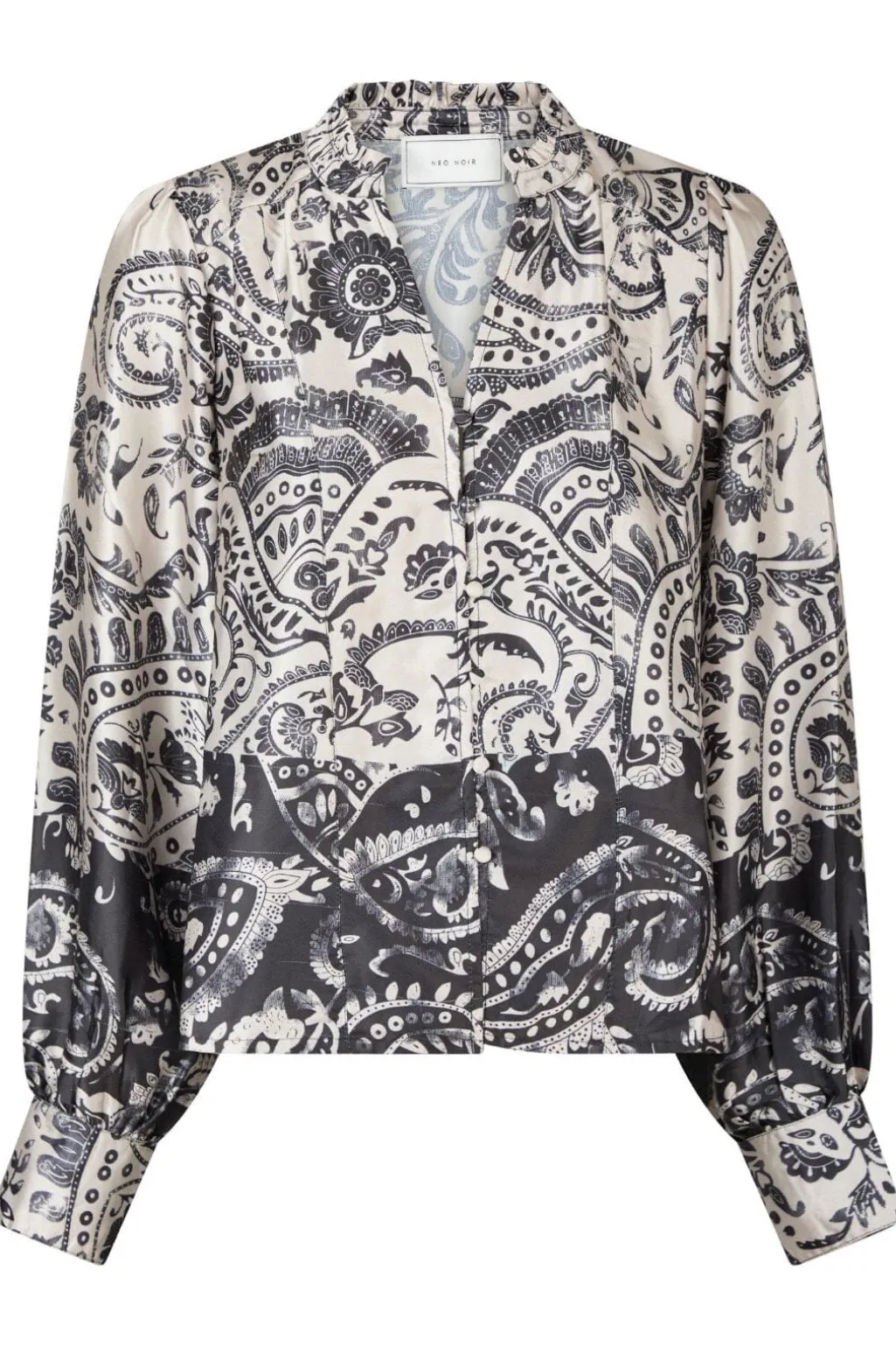 Cremefarvet bluse fra Neo Noir med sort og hvidt paisley-mønster. Blusen har V-udskæring, lange ærmer med manchetter og flæsedetaljer på forsiden.