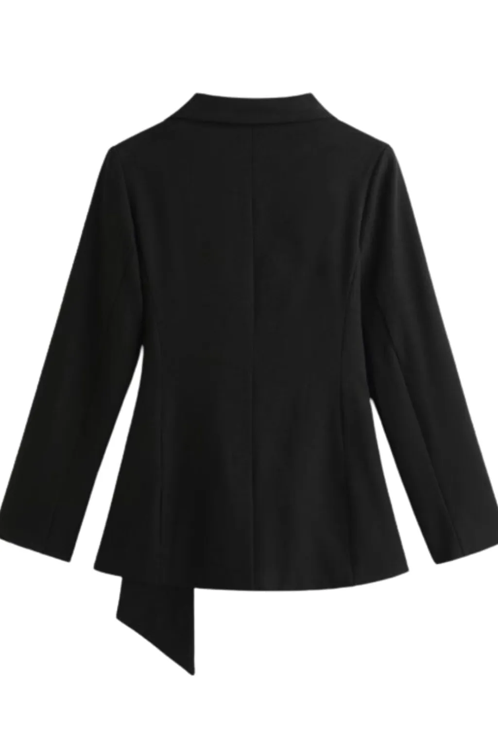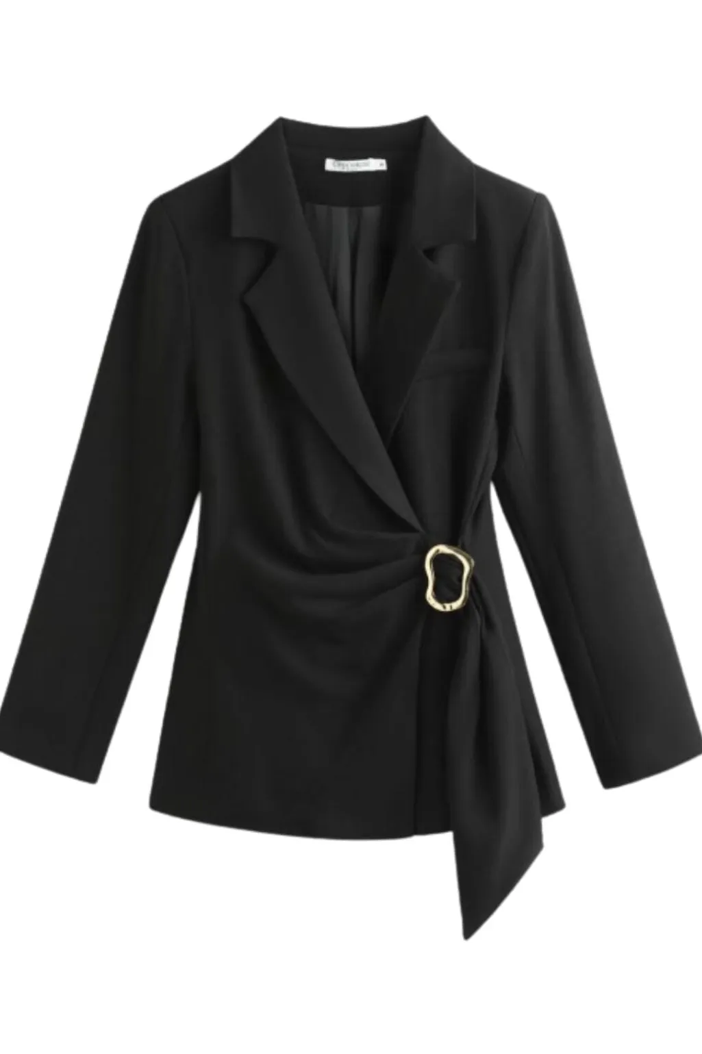 Sort blazer fra A-bee med V-hals og asymmetrisk snit. Blazeren har et guldspænde i taljen og bindingsdetaljer.