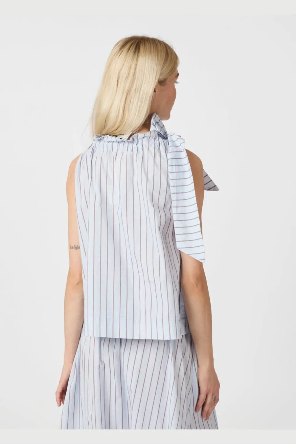 Stribet top fra Neo Noir i lyseblå med brune striber. Toppen har en halterneck med bindebånd og en sløjfedetalje på skulderen.