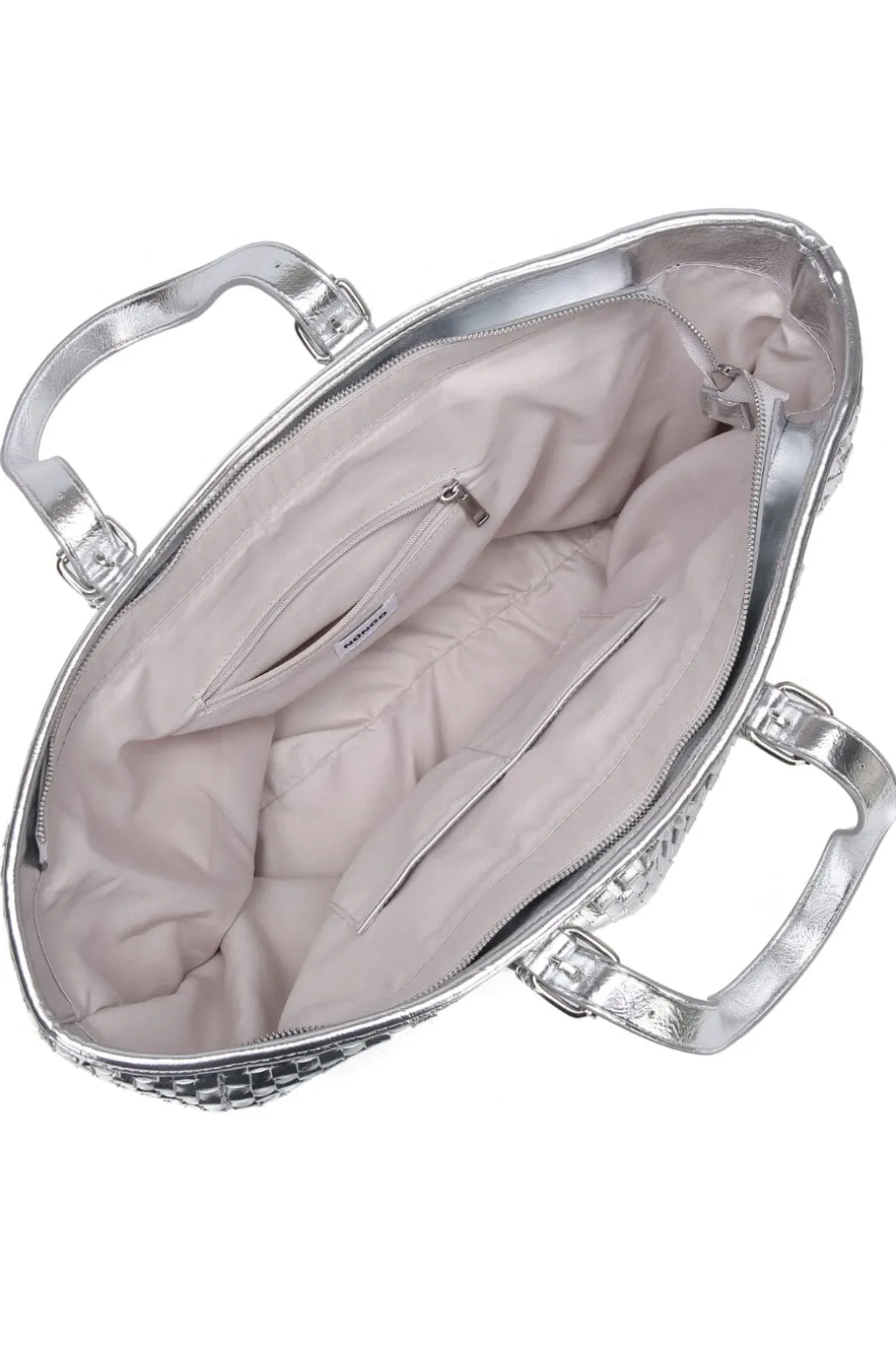 Sølvfarvet maxi shopper fra Núnoo med et flettet design. Tasken er fremstillet af genanvendte materialer og har et håndlavet udtryk med sine flettede detaljer.