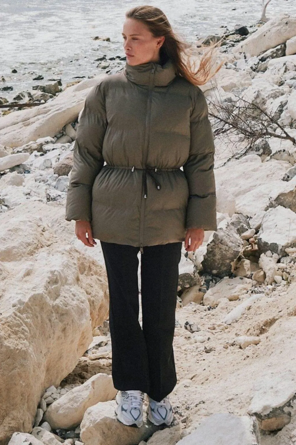 Pufferjakke fra Neo Noir i mørk taupe. En vatteret jakke med høj krave og quiltet design.