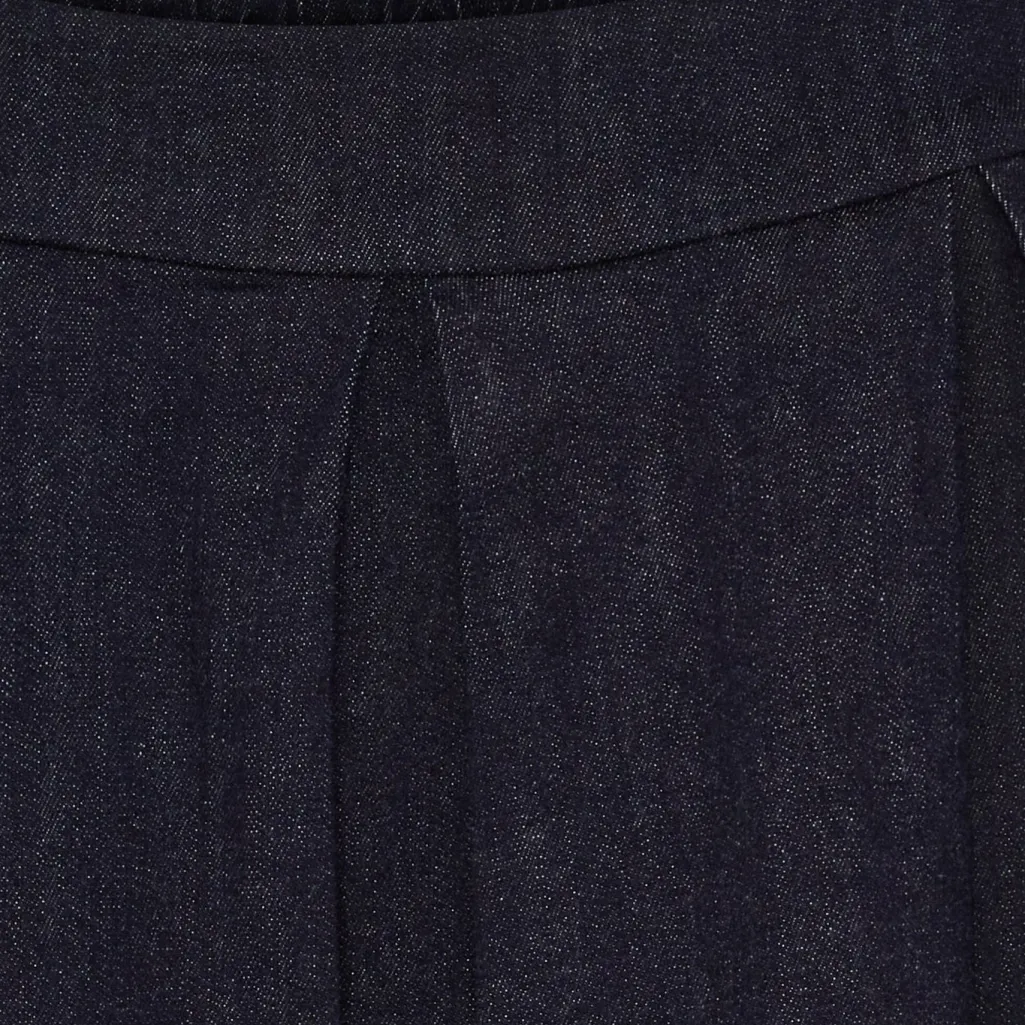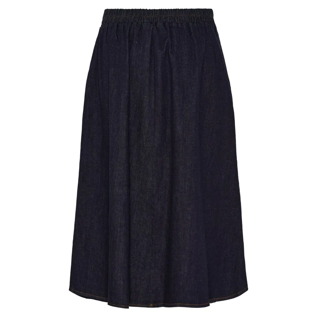 Mørkeblå nederdel fra Marta Du Chateau. Nederdelen har en høj talje, lægdetaljer foran og en bred linning med dekorative syninger.