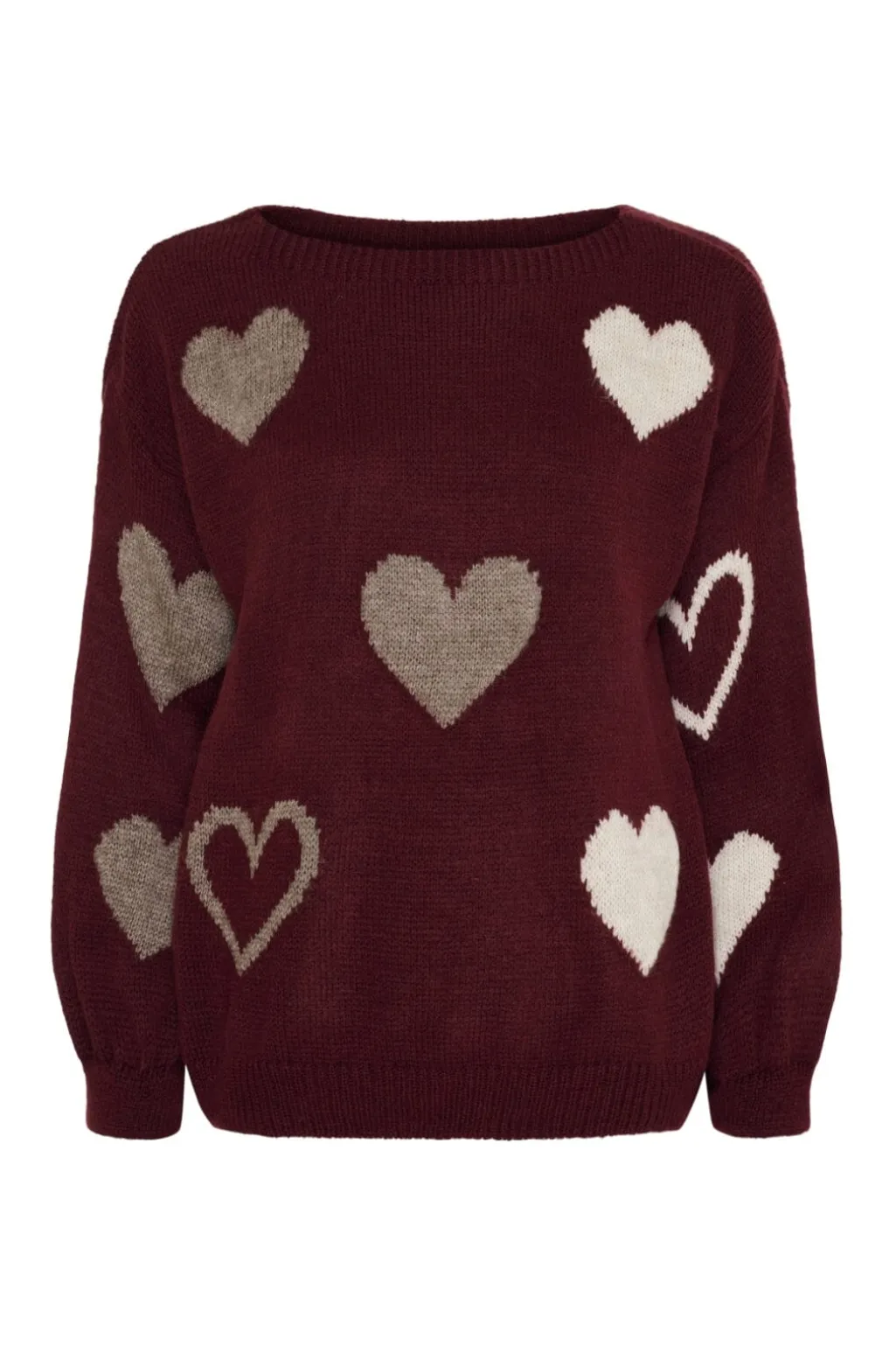 Vinrød strik fra Marta Du Chateau med hjerteformede mønstre i forskellige nuancer. Strikken har en rund hals og lange ærmer.