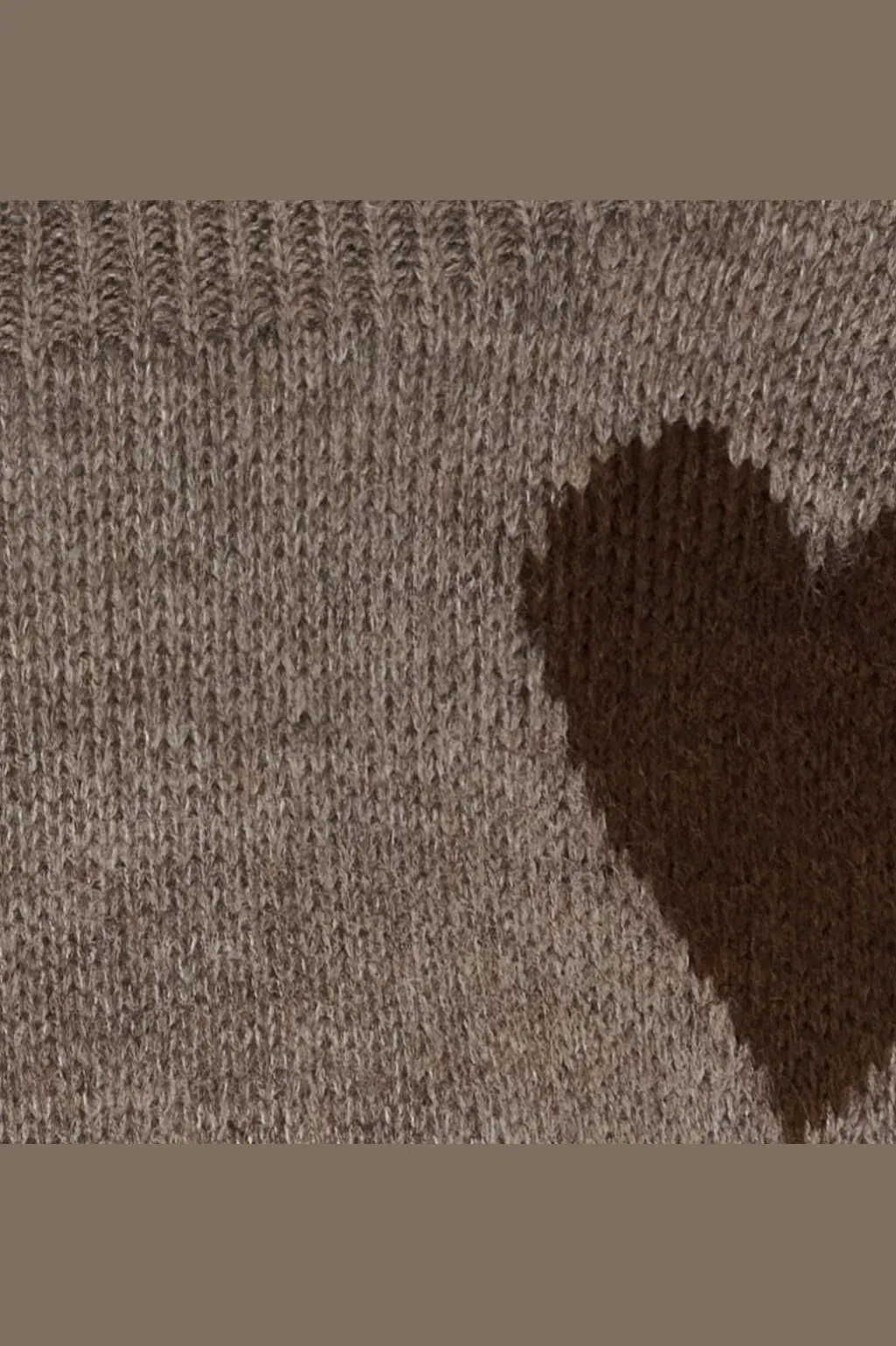 Brun strik fra Marta Du Chateau med hvide og brune hjertemønstre. Strikken har en løs pasform og ribkant ved halsen og ærmerne.