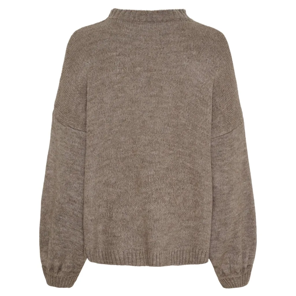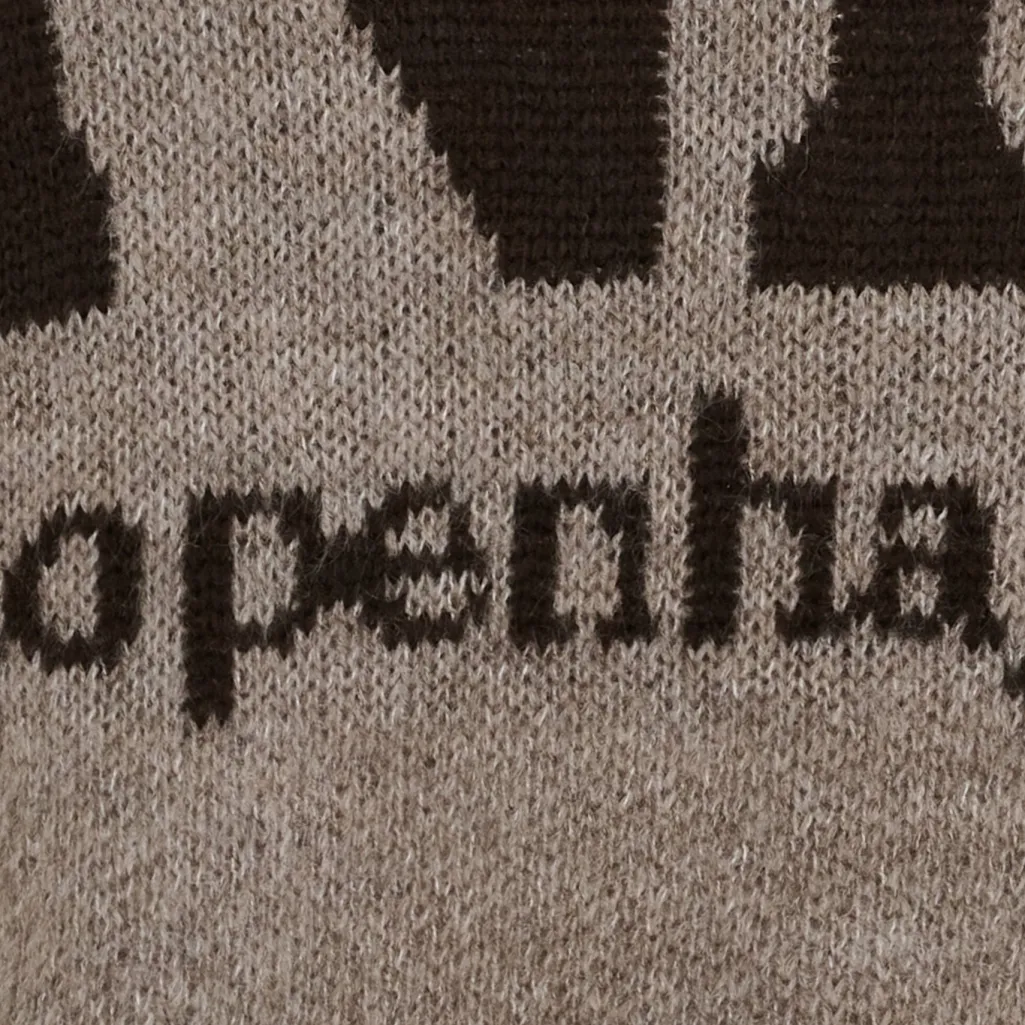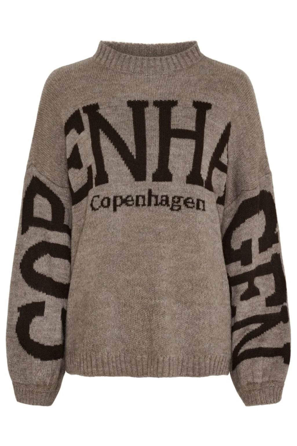 Striktrøje fra Marta Du Chateau i en mørk brun nuance med stort Copenhagen-print på forsiden og ærmerne. Strikken har en oversized pasform og en rund halsudskæring.