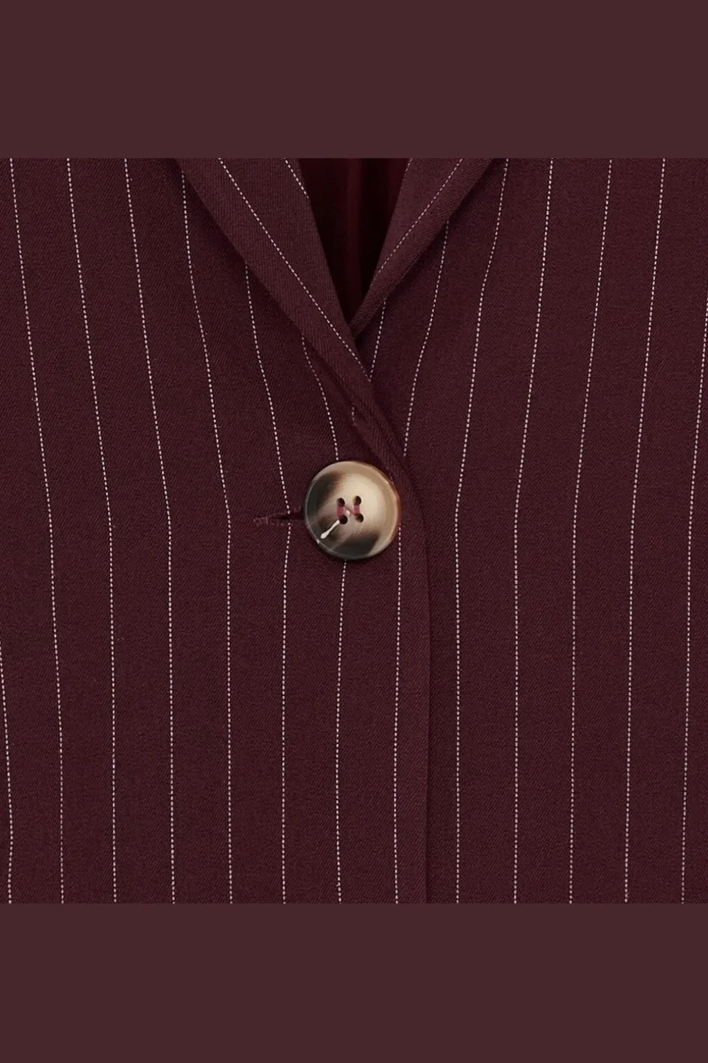 En bordeauxfarvet blazer fra Marta Du Chateau med tynde lodrette striber. Blazeren har en enkelt knaplukning med en stor marmoreret knap.