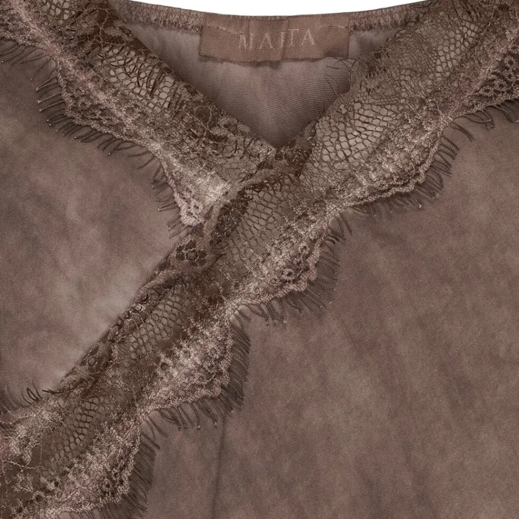 En top fra Marta Du Chateau i en mørk chokoladebrun farve. Toppen har tynde stropper og blondekanter ved halsudskæringen og nederst.