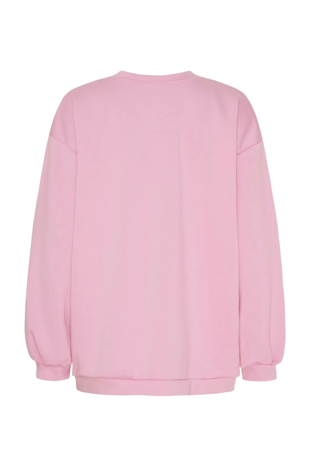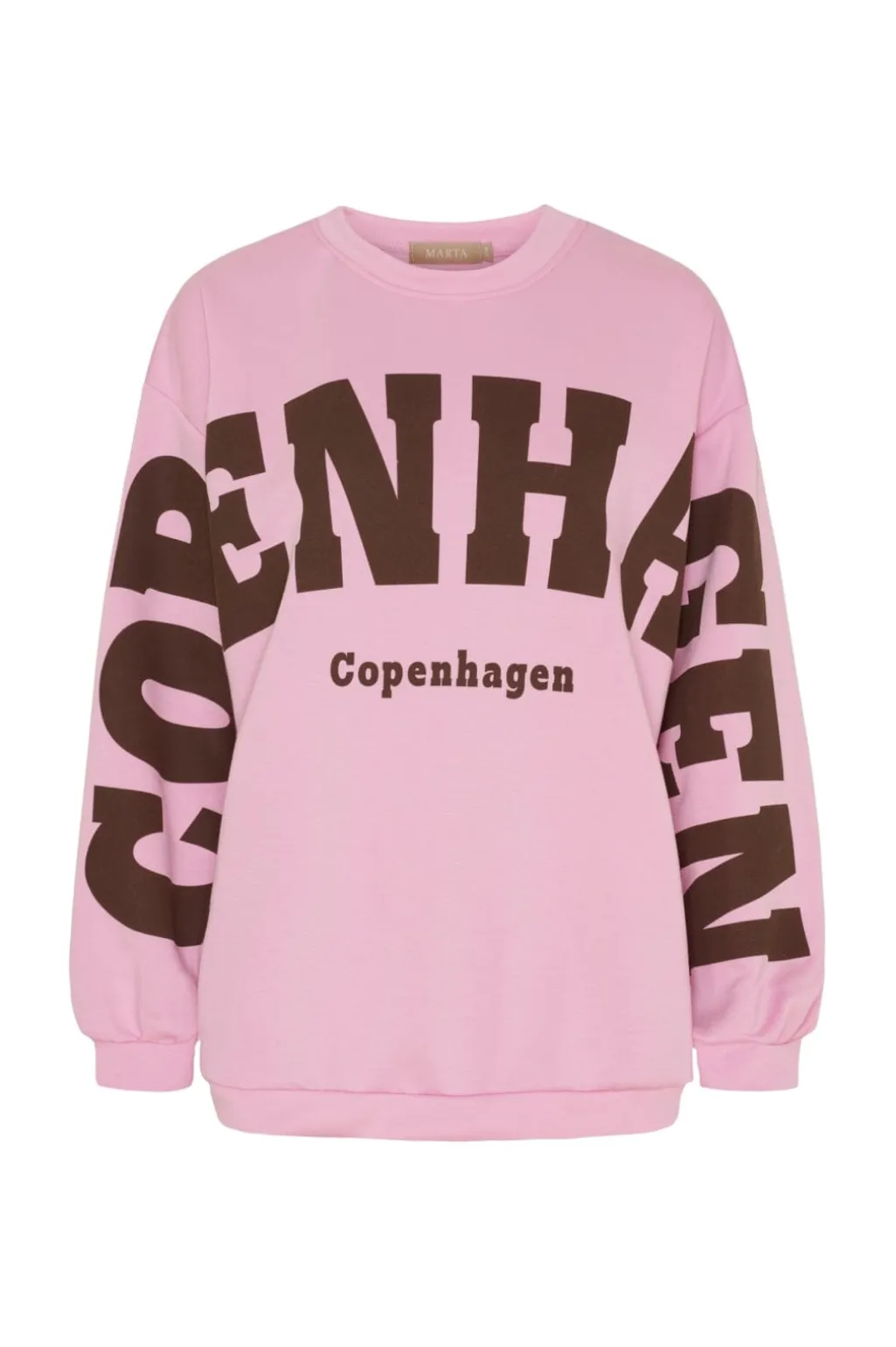 Lyserød sweatshirt fra Marta Du Chateau med sort Copenhagen-tryk på brystet og ærmerne. Den har en løs pasform og rund halsudskæring.