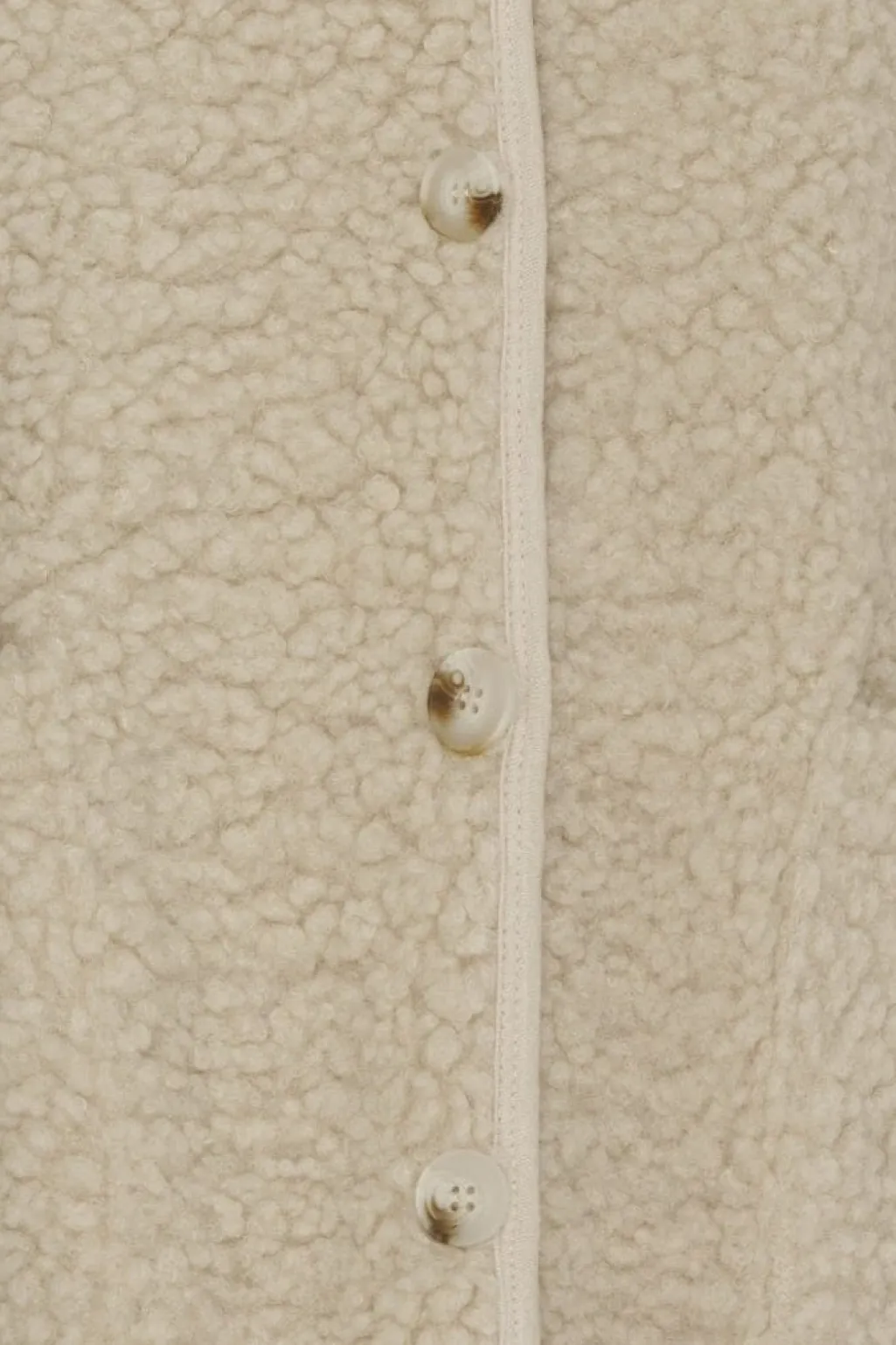 Beige jakke fra Marta Du Chateau, lavet af polyester. Jakken har en rund halsudskæring, knaplukning og to store lommer foran.