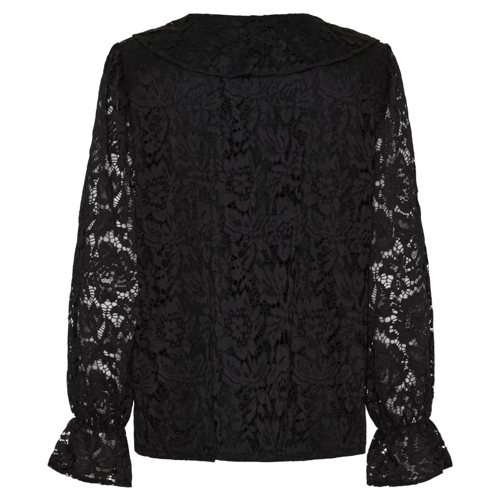 Sort blondebluse fra Marta Du Chateau med V-udskæring og flæser. Blusen har lange ærmer med blondedetaljer og passer til både formelle og afslappede sammenhænge.
