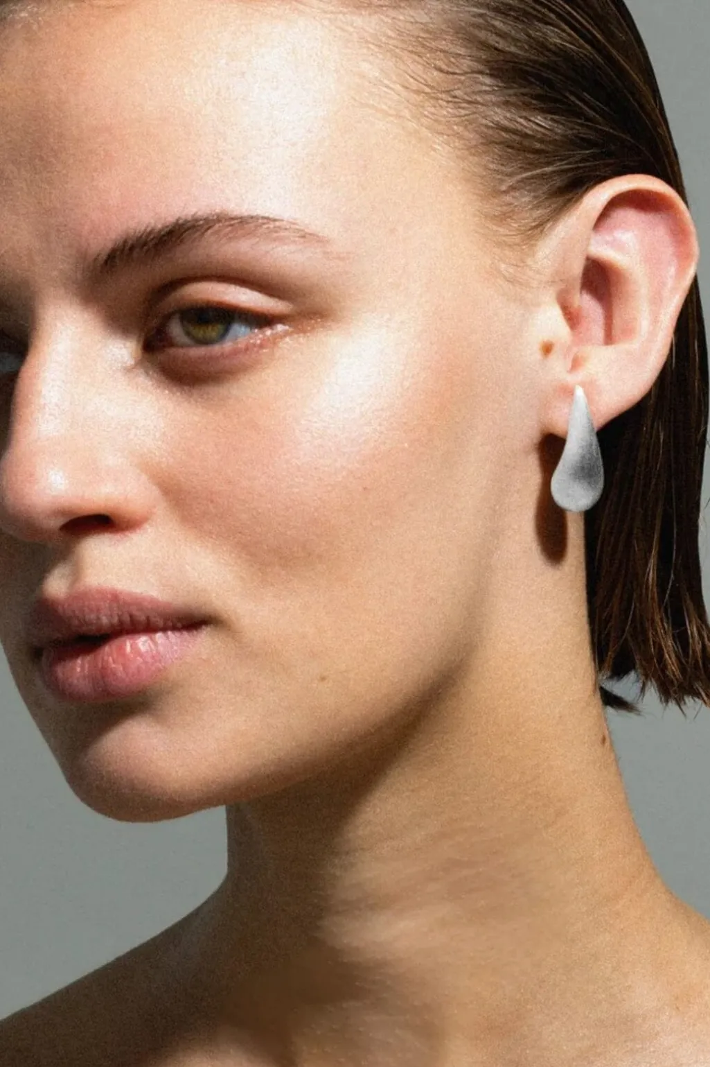 Forsølvede ørestikker fra Jane Kønig med en organisk dråbeform. Øreringen har en børstet overflade, der giver en mat finish og fremhæver den buede form.