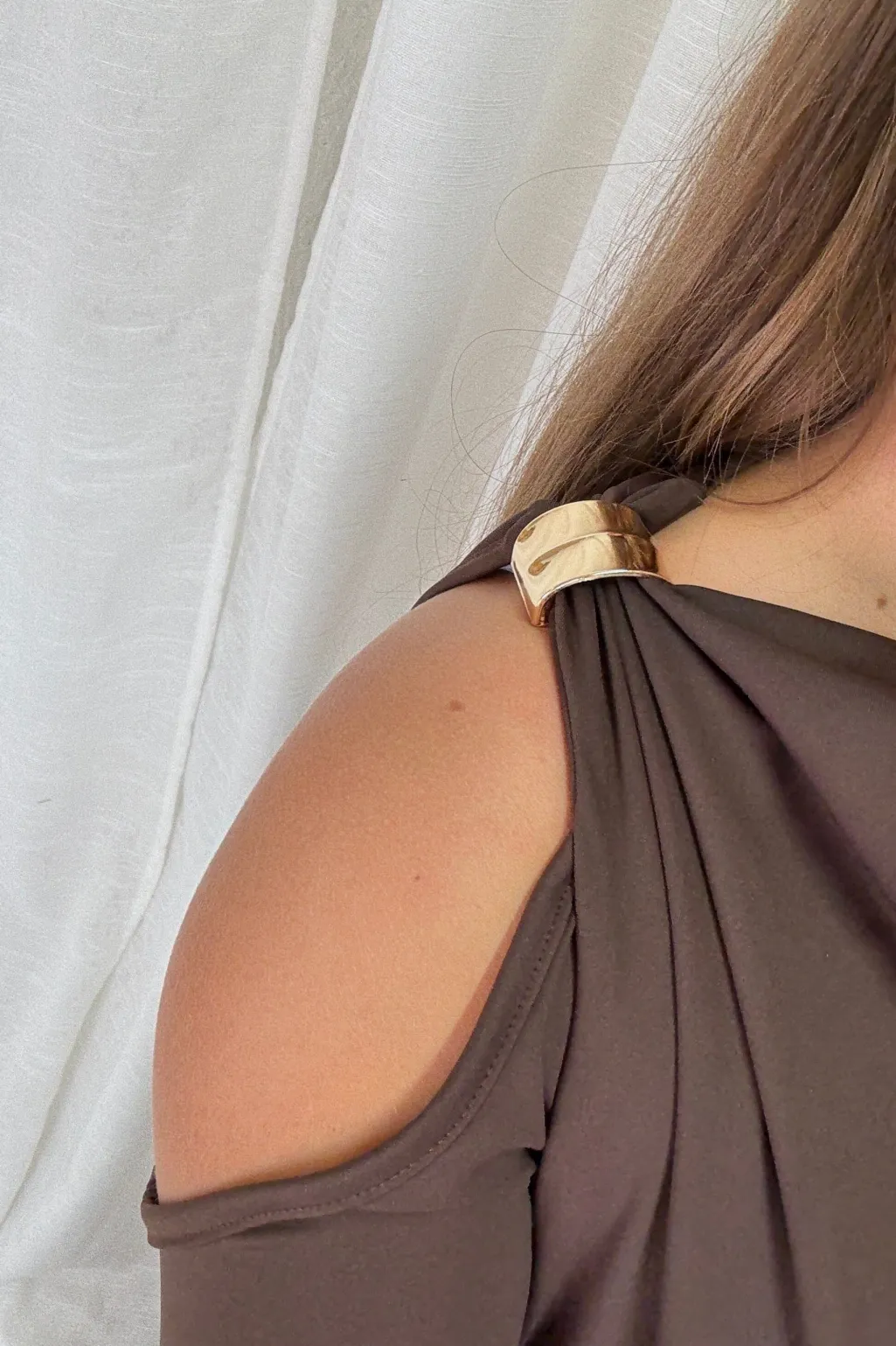 Mørkebrun bluse fra A-bee med åben skulder og gulddetalje. Blusen har lange ærmer og en draperet halsudskæring.