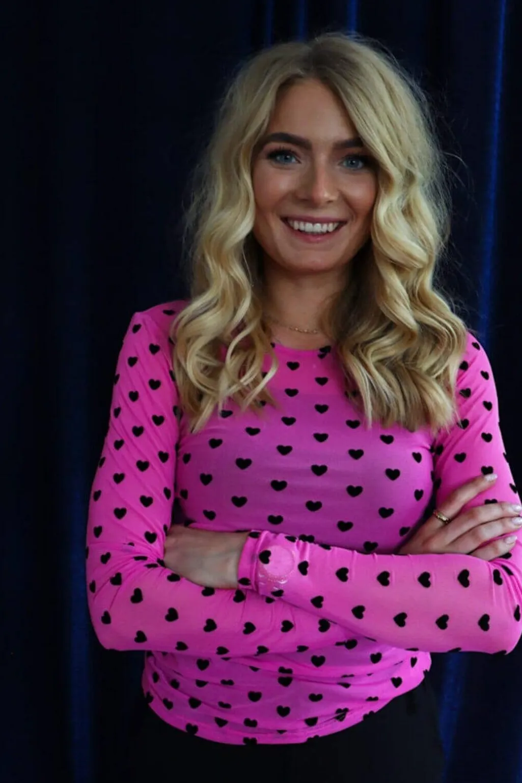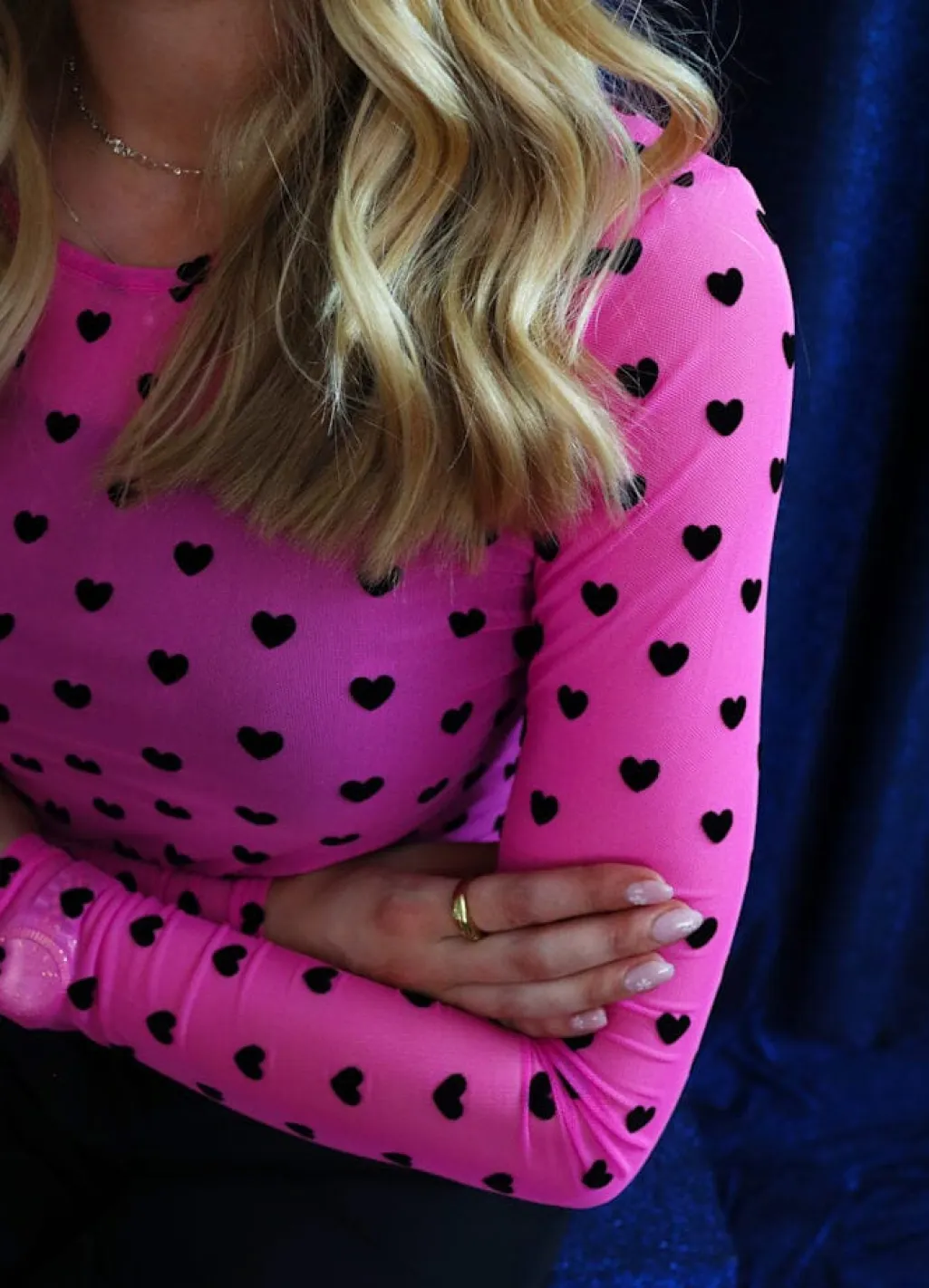 Pink langærmet mesh t-shirt fra Liberte med sorte hjerter på hele overfladen. T-shirten har en slim fit-pasform og rund hals.