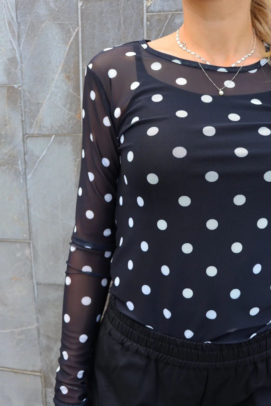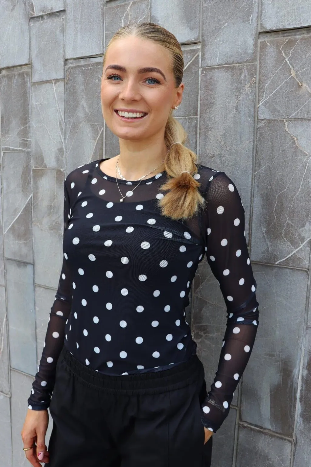 Mesh t-shirt fra Liberte i sort med hvide polka dots. T-shirten har lange ærmer og en tætsiddende pasform.