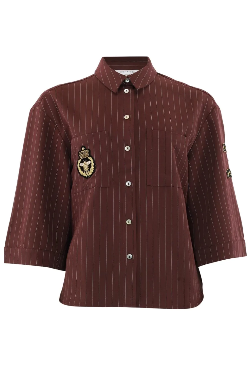 Skjorte fra Continue i bordeaux med pinstripe-mønster. Dekorative emblemer på venstre brystlomme og venstre ærme giver skjorten et personligt præg.