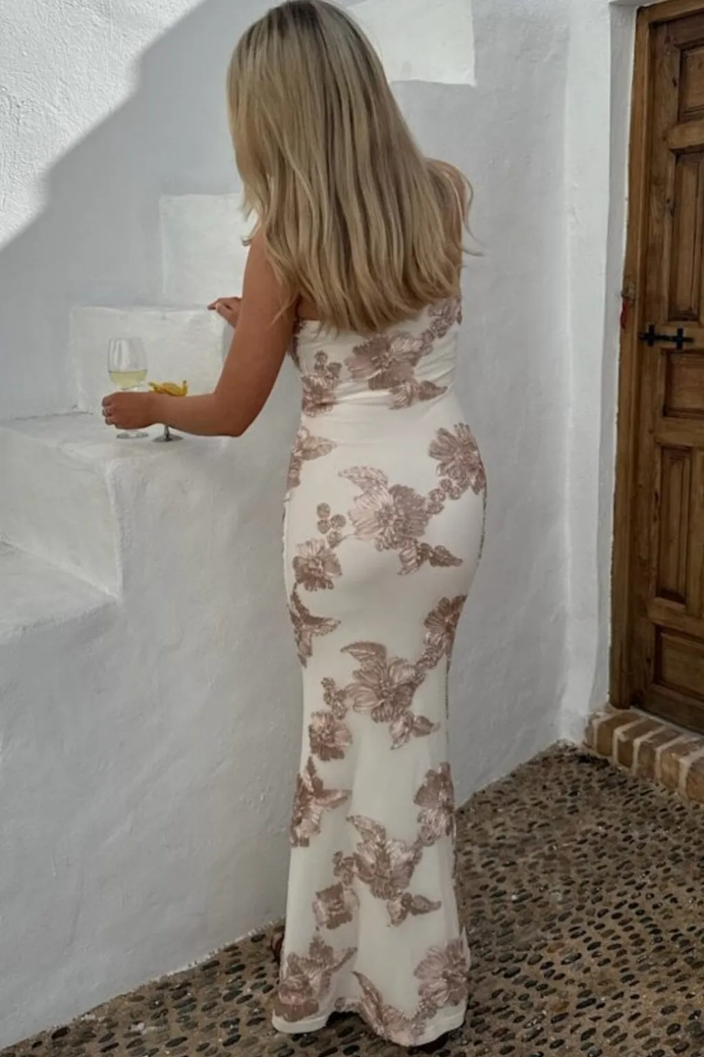 Meshkjole fra BYIC med beige blomsterbroderi på off-white baggrund. Kjolen har en tætsiddende silhuet og bindebånd ved skuldrene, der giver mulighed for justering.
