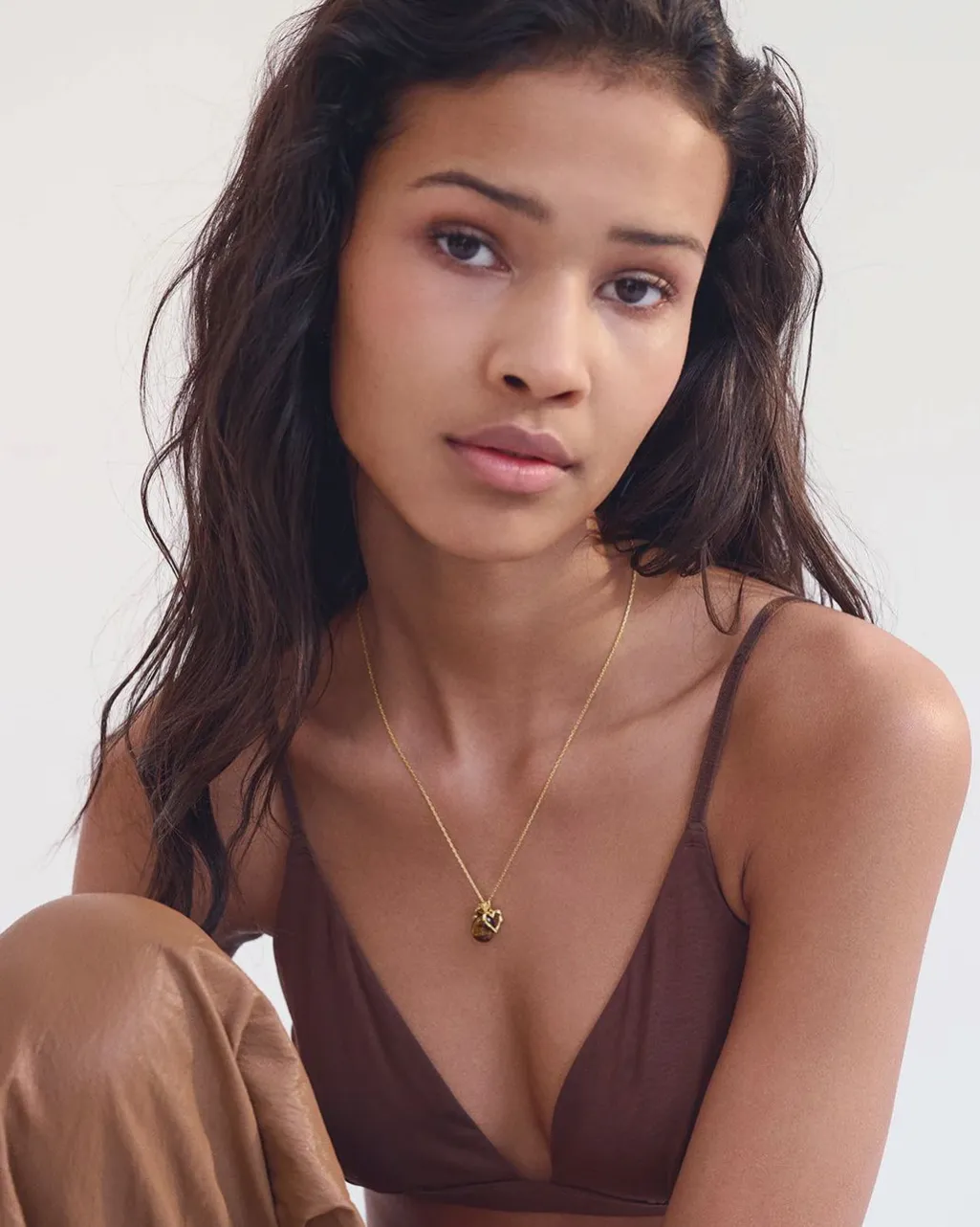 Et vedhæng fra Maanesten med et hjerteformet design. Det er lavet af genanvendt sterlingsølv belagt med 18 karat guld i en gylden farve.