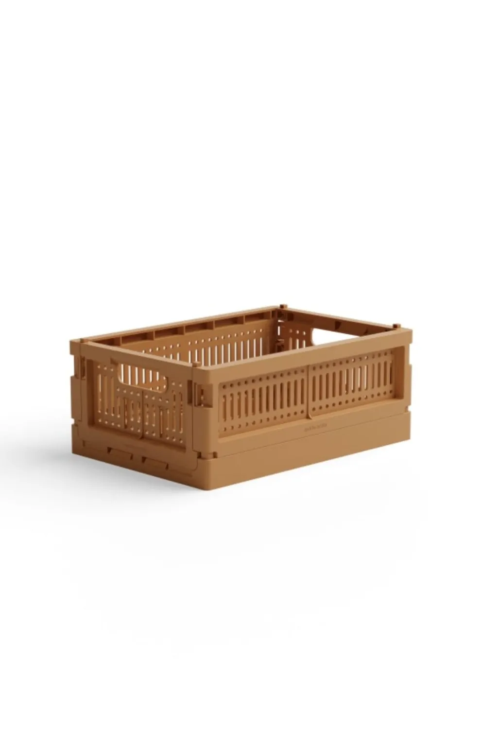 Sammenklappelig opbevaringskasse fra Made Crate i toffeefarvet, genanvendt PP-plast med hulmønster. Velegnet til køkkenet og kan stables med andre kasser.