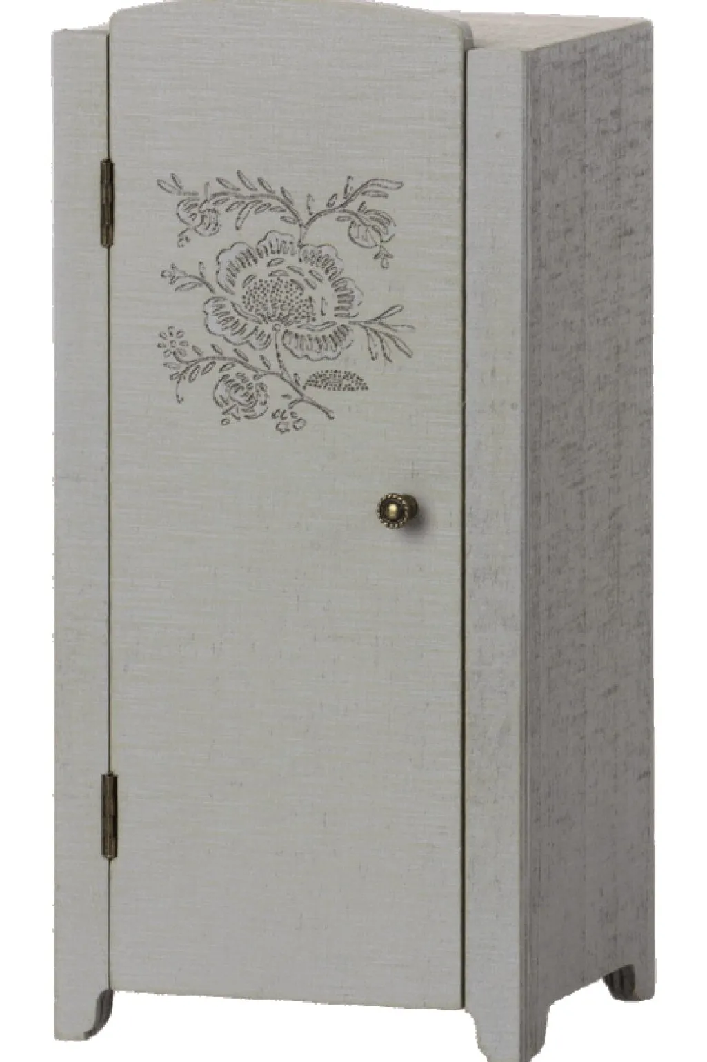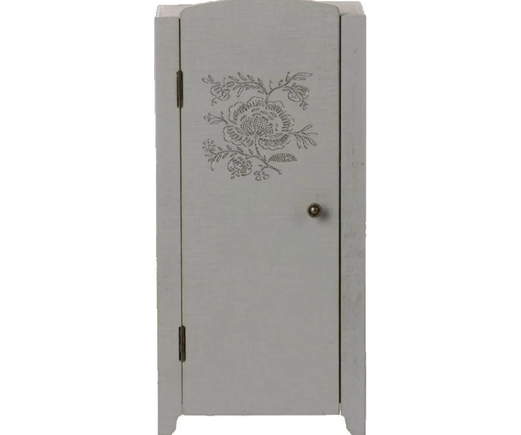Et gråt miniature skab med blomstermønster på lågen. Skabet har indvendigt tapet og hylder, der passer til Maileg dukkehuset og giver plads til små legesager.