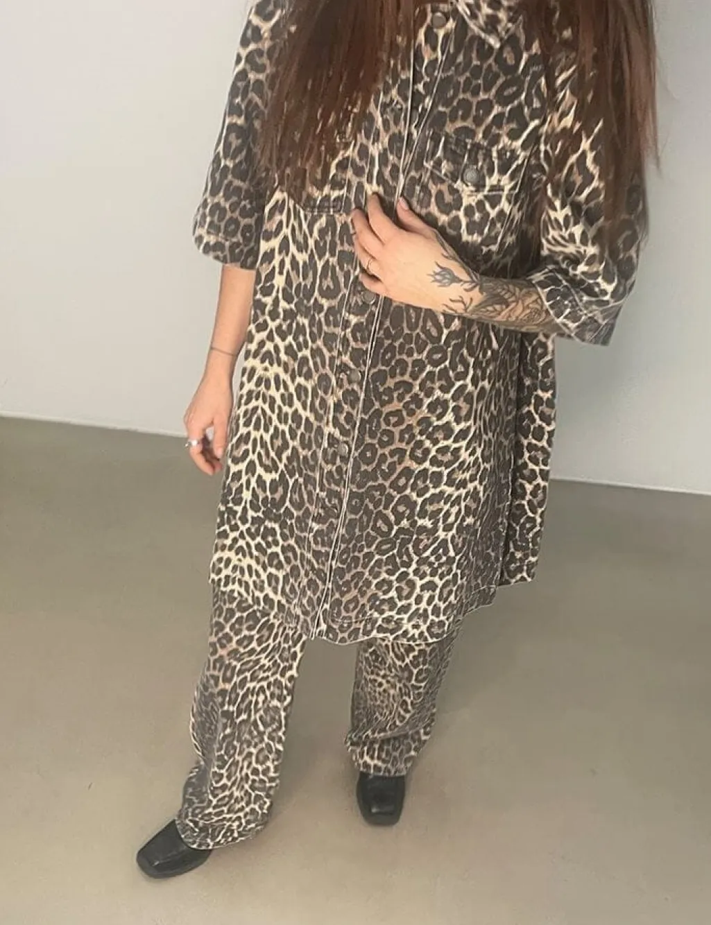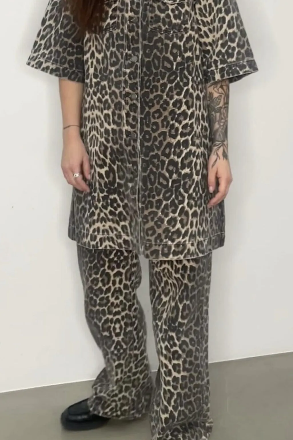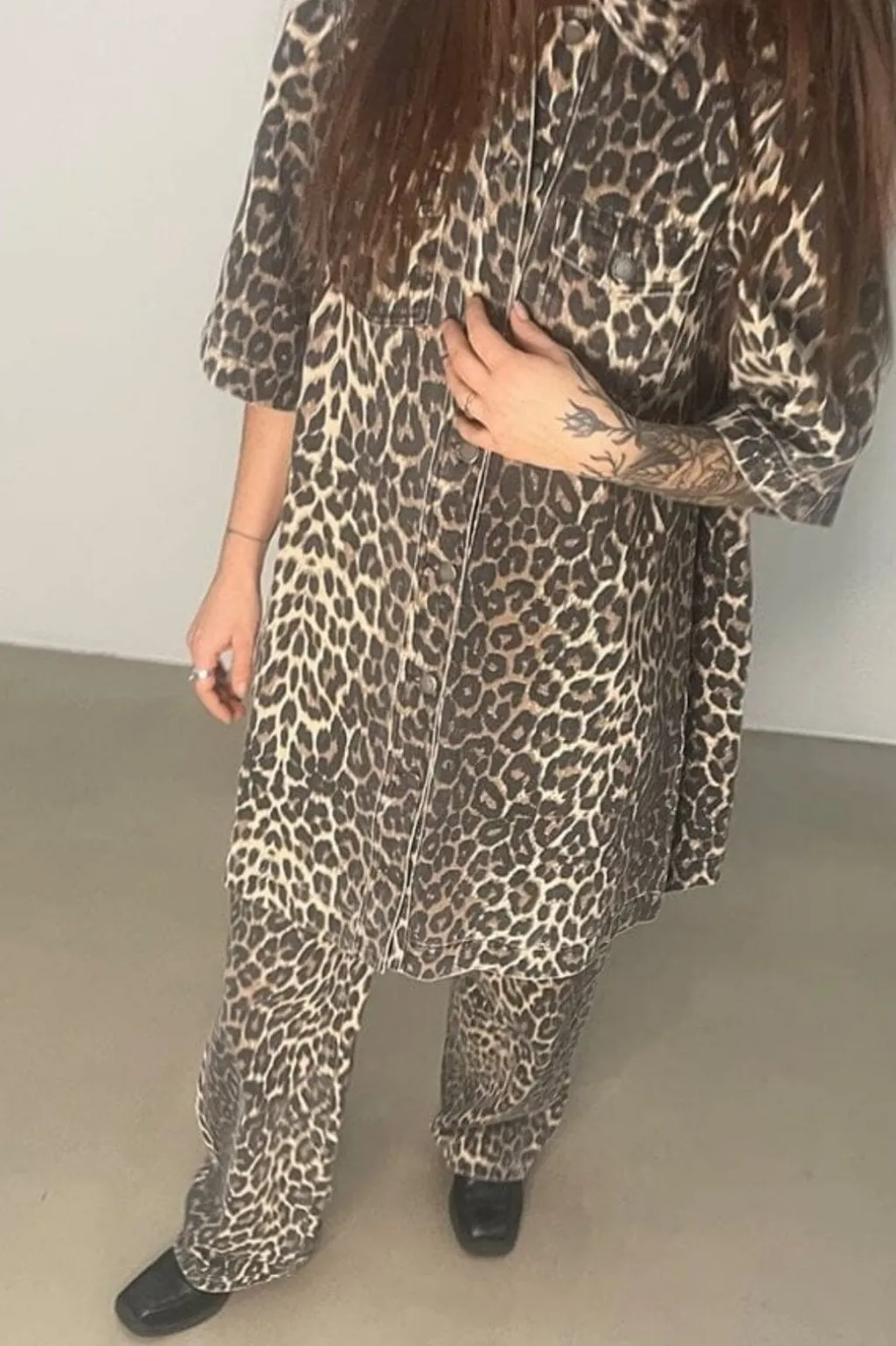 Kjole fra Global Funk med leopardmønster i brun, sort og beige. Den har en løs pasform med korte ærmer og skjortekrave. En brystlomme og dekorative syninger giver kjolen karakter.
